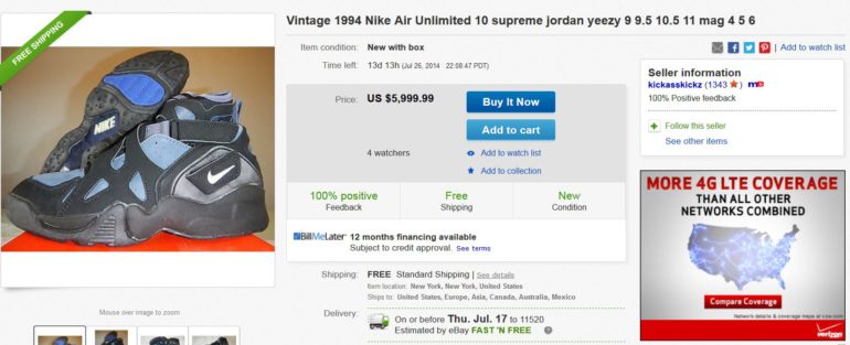 Last time it was an Adidas Run DMC sweatshirt priced at $4,000.00 and this time its the Nike Air Unlimited. Make no mistake about it, this 1994 pair of Nike Unlimited is dope. However, and while I respect that something is worth what someone is willing to pay; they are no where near the price of a solid used car at $6,000 dollars. Prices for these shoes usually go for 100-maybe 250 USD so you have to wonder where this six THOUSAND dollar price tag came from. Could it be the seller just wants to generate some extra traffic to his page? Possible. Either way, give yourself a good chuckle and check out his non negotiable listing. Via eBay.