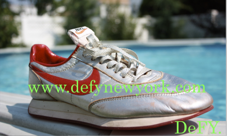 This has to be one of the most interesting Nike sneakers ever produced. At a time where most people were thinking inside the box someone at Nike was thinking outside, wayyyyyyy outside the box. Although I have seen some people say that their pairs were from the lat 70’s personally I haven’t seen them. This pair was made in 1982. The shoe was a limited production run, mostly reserved for celebrities, and employees. There was an article in sole collector (as you can see from the pics below) on these and there was an interesting story about a mom and pop owner that had the foresight to order a bunch of pairs. This shoe was an ode to the disco era and definitely made for dancing (look at the bottom of the shoe). I obtained this pair from a former Nike employee that worked at Nike headquarters for over 18 years. He told me some priceless stories about Nike in its earlier days. The number 7 written on the inside Nike label indicates that this was an employee shoe. Notice, these were made in the USA. This was before Nike moved production overseas. I was told at the time, Nike had factories in the USA, Japan, and Taiwan. Nike eventually shut down US manufacturing due to the high number of defective products coupled with tons of bogus work mans comp claims. Japanese production was shut down not because of quality issues (I was told Japan had the lowest return rate) but because of the high cost of manufacturing (during this time Japan’s economy came into its own). This pair, as hard as it is to believe was still wearable when I obtained them. I did limited walking in them and ultimately decided to sell them off, they felt very delicate although the mid soles was solid. The nylon uppers is very very light weight (feels like your wearing a sock with a midsole attached to it). They run snug so if your hunting for a pair go a half size up. Wearable pairs do exist (but are extremely rare). I have to say It would be very very interesting if Nike decided to retro this shoe. Anyhow check out the pictures below from the DeFY. New York Vault, PLUS! Bonus pictures of Mr. David Hasselhoff and Michael Jackson Killin it with the Nike Night Tracks!!!!!!!! (Those two pictures were not taken by DeFY. New York.)
