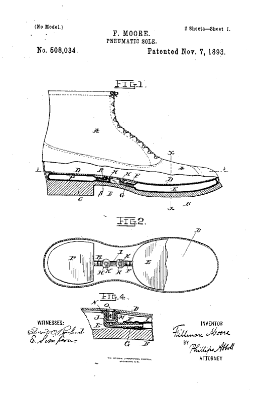 Per the United States Patent office, Fillmore Moore of Farmington Connecticut technically built the first inflatable shoe. The technology is described as a “rubber bag made air tight and provided at one end with a stem which encircles a steel tube which is turned at right angles and on the other end thereof is arranged an inflation valve which may be the same or substantially the same as that used for inflating footballs.” The patent goes on to say that “when the screw plug is turned so as to be lifted above the packing, air can be blow into and out of the bag.” It ends with “I claim a shoe having an elastic air tight bag between the insole and the outsole, a stem on the bag, an inflating tube and valve accessible for the purpose of inflation, the inflating valve and stem being located in a channel made in the upper side of the outsole at or near the instep of the shoe, substantially as set forth.” You can also check out a Reebok Patent for the Pump which Cites the Pneumatic sole first. With that said, we should thank our lucky feet that Reebok evolved Moore’s technology into the pump we know and love today.