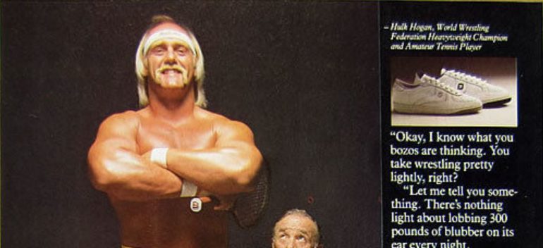 Nike had John McEnroe and Foot Joy had………….Hulk Hogan? Over the past two years you’ve probably seen the Hulkster show up on your Facebook timeline being presented as a die hard sneaker head (and while that might or might not be true) one things for sure, he’s been in the shoe game in some form longer than some people have been on this earth. In 1985 Foot Joy enlisted the pro wrestling icon to help promote their Extra Lights tennis shoe. They were advertised as super light weight and very comfortable thanks to an EVA wedge but that really doesn’t matter today. What does matter however is that Hulk wore these sneakers in an ad while standing on someone’s back and for that you might want to add them to your collection. Off to eBay you go but before you dipset out of here check out the ad below!
