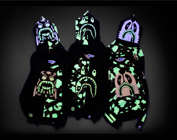 Glow in the dark has been hot the past few years. Its an option available on NikeID, it was an option on Converse ID, Reebok and Adidas both have pumped out glow in the dark kicks and various companies have pumped out glow in the dark gear. Well, you can add A Bathing Ape to that list. While glow in the dark gear is nothing new (forget the past few years glow in the dark gear goes back decades) its the first time for Bape. Prints are dope quality is solid and with a die hard following don’t expect these to sit. Available for pre-sale at ZOZO Via Freshness