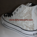 In 2006 Converse did a collaboration with Graffiti artist Mike Giant showcasing his artwork laser etched into both the Converse Pro Leather and the Converse All star. This was an urban release, and the quality was very nice. They came in a standard converse box, with a special key chain. If your into Graffiti these will not disappoint. If your looking for a set they have become slightly difficult to come by, and run slightly big. One key issue you should check for when looking for a set in your size is to make sure the laser etching is not faded. This was an issue with the Converse all stars) laser etching. (The white version of the Mike Giant Chuck T was the Womens Version. Below are pictures of the white pair from the DeFY. New York Photo vault enjoy!