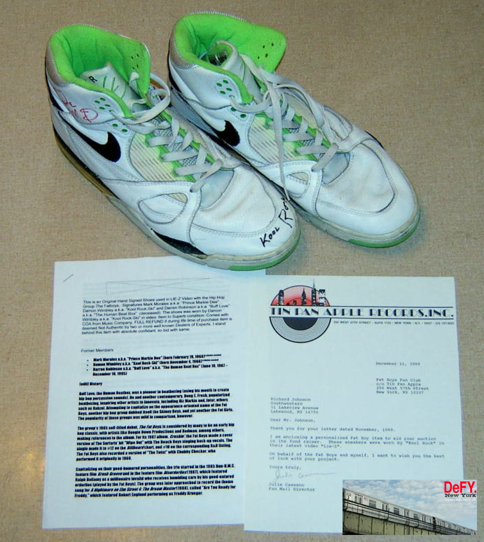 Worn by Kool Rock of the Fat Boys (as seen on the color of On and On) this color way was never released to the public (atleast to my knowledge). Neon green accents make an already desirable shoe that much more desirable.