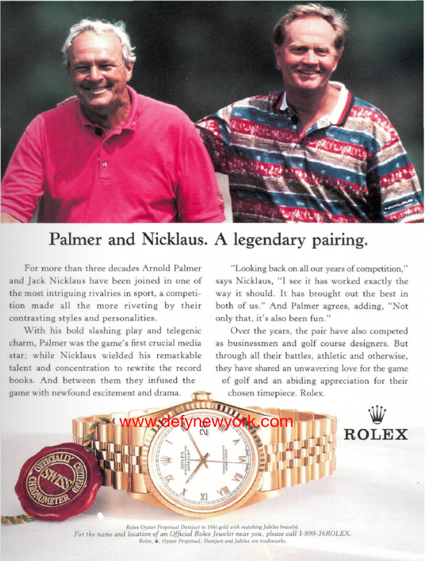 Accessories (Watches)FashionFashion (1990-1999)Fashion (Rolex)Men's FashionRolex Oyster Perpetual Datejust Arnold Palmer And Jack Nicklaus 1998 Gotta love a solid gold Rolex. Check out this 1998 ad below. Share this: Click to share on Facebook (Opens in new window) Facebook Click to share on Pinterest (Opens in new window) Pinterest Click to print (Opens in new window) Print Click to share on X (Opens in new window) X Click to share on LinkedIn (Opens in new window) LinkedIn Click to share on Tumblr (Opens in new window) Tumblr Click to email a link to a friend (Opens in new window) Email Click to share on Reddit (Opens in new window) Reddit