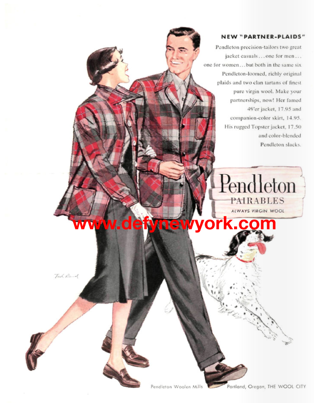 FashionFashion (1950-1959)Fashion (Pendleton)Men's FashionPendleton Pairables Partner-Plaids Jackets 1955 So you thought the idea of matching up with your significant other was something “played out” because you were doing it in 2001. Truth be told, Pendleton had you beat by about 50+ years. Check out the Partner-Plaids Jackets from 1955 below. Share this: Click to share on Facebook (Opens in new window) Facebook Click to share on Pinterest (Opens in new window) Pinterest Click to print (Opens in new window) Print Click to share on X (Opens in new window) X Click to share on LinkedIn (Opens in new window) LinkedIn Click to share on Tumblr (Opens in new window) Tumblr Click to email a link to a friend (Opens in new window) Email Click to share on Reddit (Opens in new window) Reddit