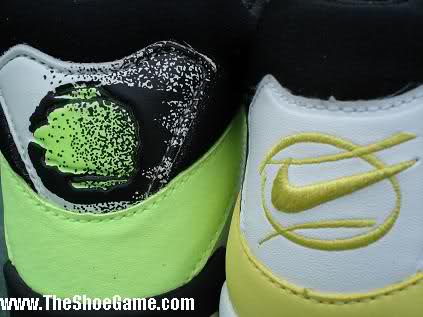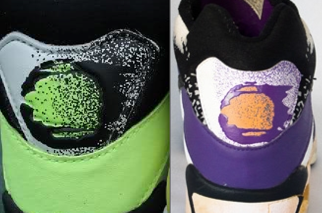 SUMMARY TO NIKE: KEEP THE NEON GREEN, HEEL STRIP SHOULD BE BLACK, FLAMING TENNIS BALL SHOULD BE ON BACK. THE PURPLE COLORWAY SHOULD HAVE THE SAME BLACK STRIP AND THE WHITE DESIGN AROUND THE BLACK COLAR, WITH NO PURPLE PAINT AROUND THE AIR UNIT AND SPECKLE PAINT TOWARDS THE FRONT OF THE SHOE.