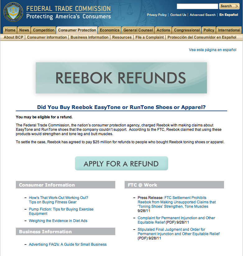 Its official. If you are one of the millions that purchased Reebok Toning shoes or apparel you may be eligible for a refund. For more info head over to the Federal Trade Commissions website http://www.ftc.gov/bcp/cases/reebok/index.shtm