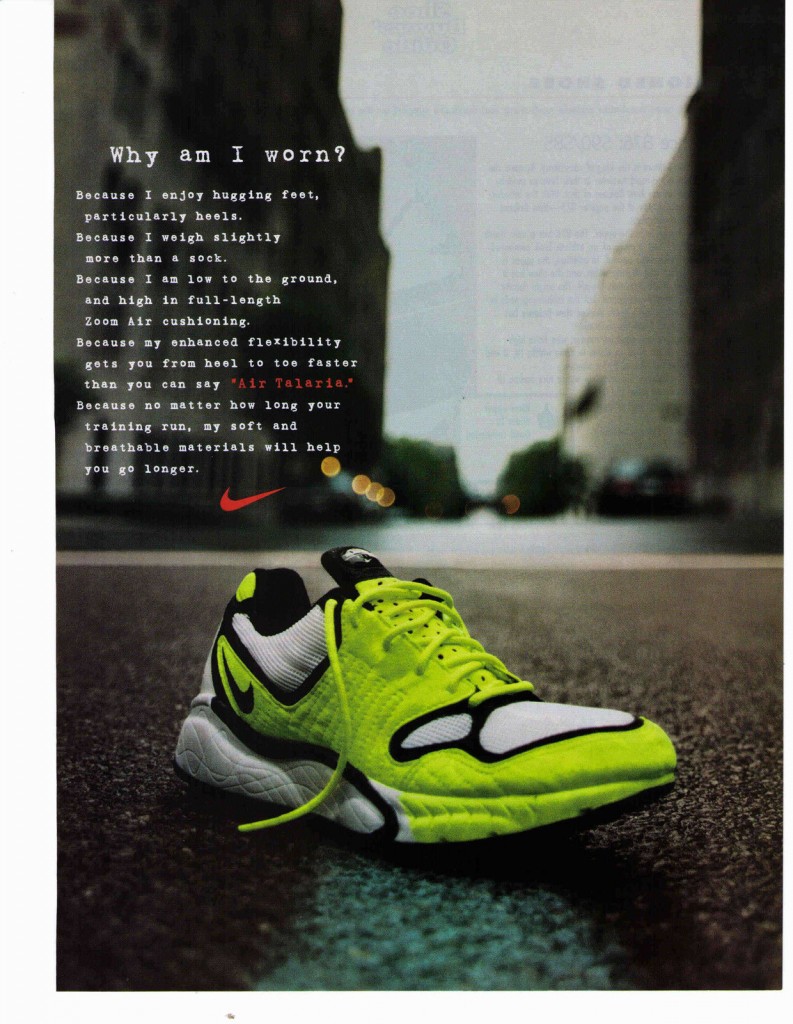 Sneakers (1990-1999)Sneakers (Nike)Sneakers/Boots/Shoes Releases, Reviews, ArchiveNike Air Talaria Running Shoe 1997-98 Released in the late 90’s the Nike Talaria is one of Nike’s secret gems. Lightweight, solid quality and of course easy on the eyes the Talaria had everything you could ask for in a running shoe. Take a trip back to 1997 below! Share this: Click to share on Facebook (Opens in new window) Facebook Click to share on Pinterest (Opens in new window) Pinterest Click to print (Opens in new window) Print Click to share on X (Opens in new window) X Click to share on LinkedIn (Opens in new window) LinkedIn Click to share on Tumblr (Opens in new window) Tumblr Click to email a link to a friend (Opens in new window) Email Click to share on Reddit (Opens in new window) Reddit