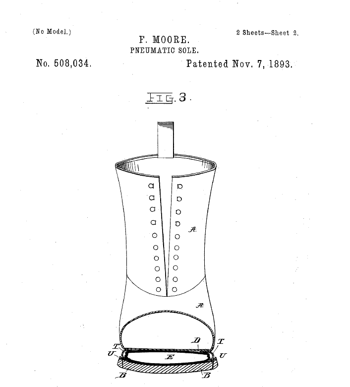 Per the United States Patent office, Fillmore Moore of Farmington Connecticut technically built the first inflatable shoe. The technology is described as a “rubber bag made air tight and provided at one end with a stem which encircles a steel tube which is turned at right angles and on the other end thereof is arranged an inflation valve which may be the same or substantially the same as that used for inflating footballs.” The patent goes on to say that “when the screw plug is turned so as to be lifted above the packing, air can be blow into and out of the bag.” It ends with “I claim a shoe having an elastic air tight bag between the insole and the outsole, a stem on the bag, an inflating tube and valve accessible for the purpose of inflation, the inflating valve and stem being located in a channel made in the upper side of the outsole at or near the instep of the shoe, substantially as set forth.” You can also check out a Reebok Patent for the Pump which Cites the Pneumatic sole first. With that said, we should thank our lucky feet that Reebok evolved Moore’s technology into the pump we know and love today.