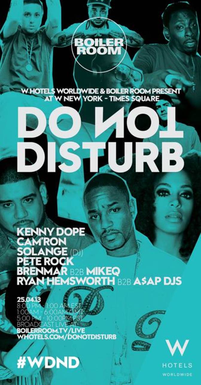 “W Hotels and Boiler Room present a intimate party for family and friends at W Times Square’s E-WOW suite on Thursday, April 25th, to be broadcasted live via W Hotels and Boiler Room’s sites. The finale to the series which kicked off in London and continued in Paris will feature performances and back-to-back DJ sets by Cam’ron, Solange, Kenny Dope, Brenmar B2B MikeQ, and Pete Rock.