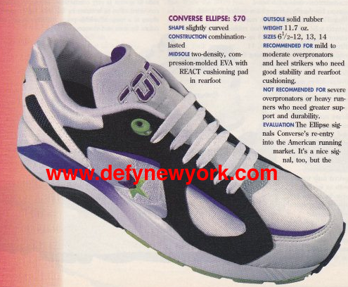 Now here’s a rarity. While a running shoe at heart the Ellipse still emitted a basketball vibe. Maybe it was the word “Con’s” across the tongue or maybe it was that purple gradient on the side of the shoe we were used to seeing on the Aero Jam but there definitely was a basketball vibe coming from this shoe. That aside, this was a clean offering from Converse and while I can’t really remember to many people wearing them (according to Runners World it was a shoe being made for the overseas market and only a limited number would be imported to the United States) looking back some 20 years I think a second release would add some converts. Some of the shoes features included a two-density, compression molded EVA with REACT cushioning pad in rear foot, solid rubber outsole and combination lasted construction. Check out this rarely seen early 90’s running shoe from Converse above!