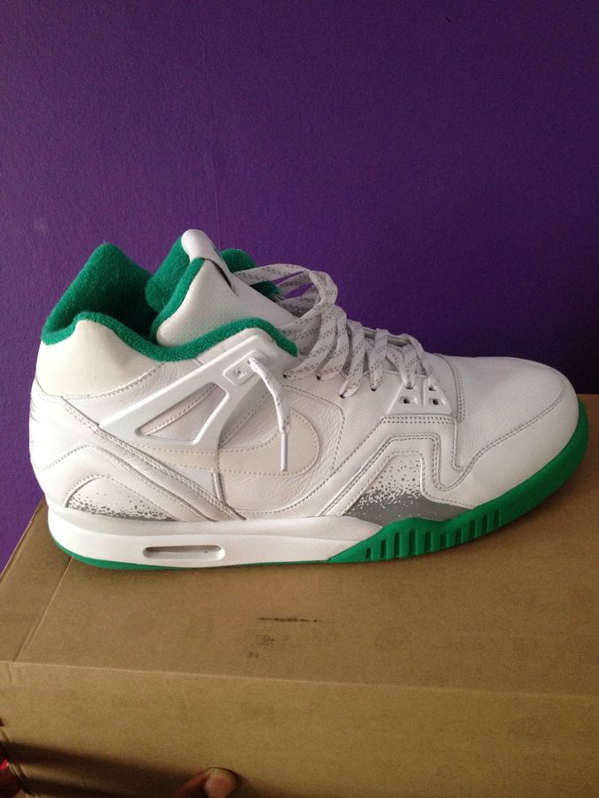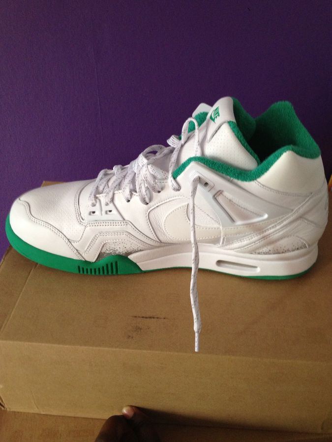 Its been 5 years and a Yeezy 2 since my favorite shoe of all time the Nike Tech Challenge II 3/4 last hit the shelves and a lot has changed since then. For one, we’ve learned that a lot of our 80’s and 90’s favorites that were retro’d once before and flopped can go on to become instant sell outs the third, fourth, or fifth retro (which sucks for the people that loved the shoe with no hype surrounding it). Enter the Tech Challenge II 3/4 Wimbledon retro. This special makeup has received a lot of positive attention since sites first started writing about them and for good reason. Sure, the colorway isn’t anything flashy but its the for that reason and the quality leather uppers that makes the shoe really stand out. It also doesn’t hurt that we’ve only seen two colorways retro’d to date so the lack of availability for a wearable pair isn’t helping matters. Add to the fact that the 2008 retro is not commanding prices in the 175-400.00 range and well, yea. So for now, they have only showed up in the UK but don’t be surprised to see them show up stateside. Also, one has to wonder what other colorway’s will show up or will this be a one and done (doubt that). Any how check out the pics below courtesy of over30andwhat of NT