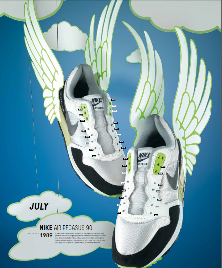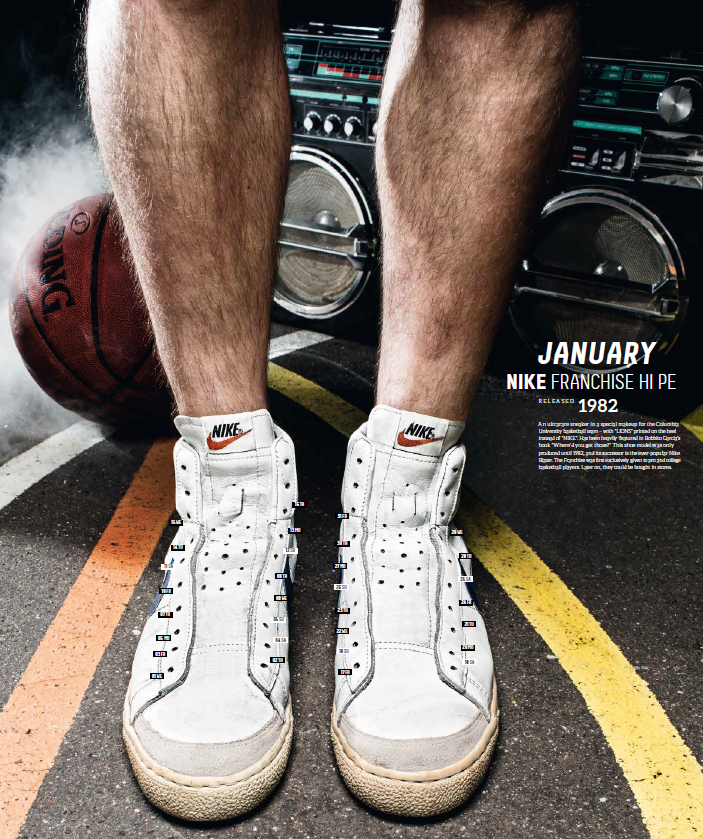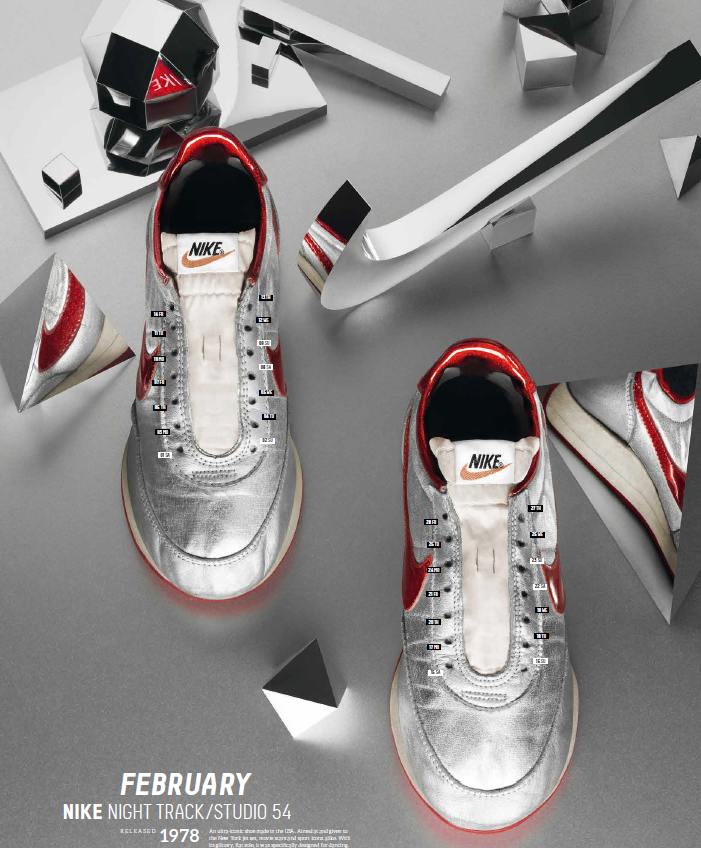 If you felt your sneaker iPhone case, sneaker documentaries, sneaker cake, sneaker shirt, sneaker keychain and sneaker hat weren’t enough and thought to yourself, ‘damn, I really need some more sneaker related products in my life’, well no sweat. The Sneaker Calendar should provide that little extra fix. Done up in large-format, with absolutely STUNNING photo’s this calendar showcases twelve of the most legendary sneakers from the past four decades (opinion of the creators of course), starting with extremely rare basketball shoes from the seventies and ranging from popular vintage models from the nineties to an original pair straight from Sir Elton John’s concert wardrobe.