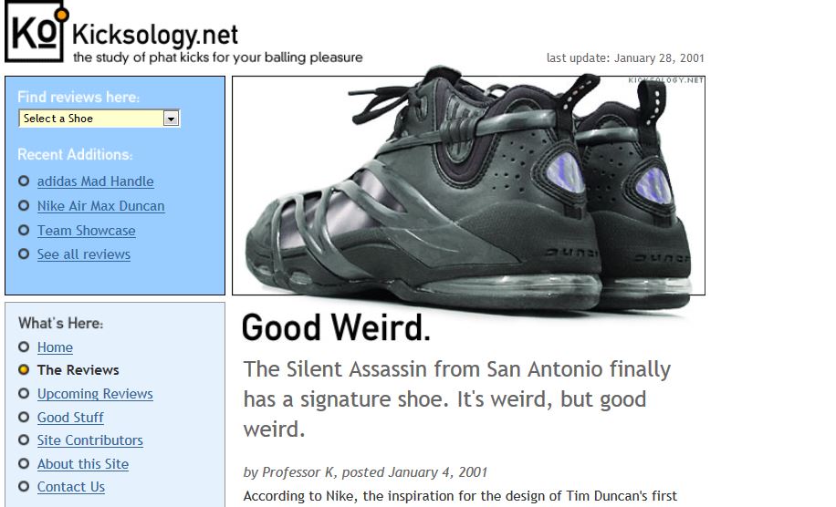 before finally closing up shop in 2004. While the site would end, Professor K’s impact on the shoe community would only grow. He would move on to a position at Sole Collector and then to Nike (first as a senior global product line manager for running footwear and then on to director of footwear innovation). Sure, its sad knowing that performance basketball sneaker reviews may never reach the height of Kicksolgy and that many of today’s performance reviewers don’t have the knowledge nor the pure passion that the Professor and his staff did, but we are still left with the memories of a site that did it better than most and the Professor continues to shape the shoe community this time, from the inside.