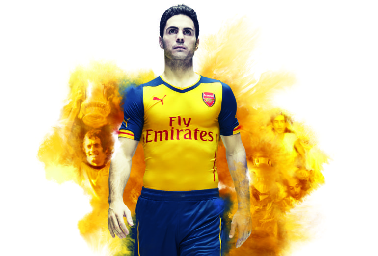 Victorious is featured as a yellow and navy blue away game shirt that has been linked to incredible Gunner moments away from the home stadium.