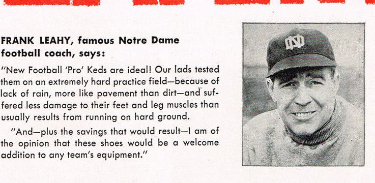 Its football season and with that comes some revisits beginning with the Keds 1954 Football shoe endorsed by one of the greatest football coaches from one of the greatest colleges of all time. While I’m sure it was some marketing guy that wrote Frank Leahy’s statement for Keds, he did allow them to use his photo as faith in the product. Deep digging molded cleats and full breathing black duck uppers make some sense for this shoe but a reinforced kicking toe would only be of importance to a kicker (unless dudes were running around kicking each other). Take a trip back below and see just how far your cleats tech and design really have come.
