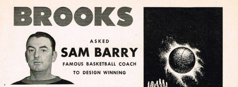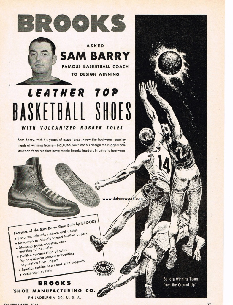 It may have been hard to believe that Brooks was a viable competitor in the basketball shoe market during the 80’s but its probably boing to be even more shocking that their basketball heritage goes back over 60+ years. Endorsed by Sam Barry Brooks was pumping out leather basketball shoes that resembled rain boots. Complete with a vulcanized rubber sole the Sam Barry Shoe featured an “exclusive scientific pattern and design, Kangaroo leather, diamond point non skid non marking rubber sole, ventilation eyelets and a special cushion heel and arch support. Check out this rare ad below!
