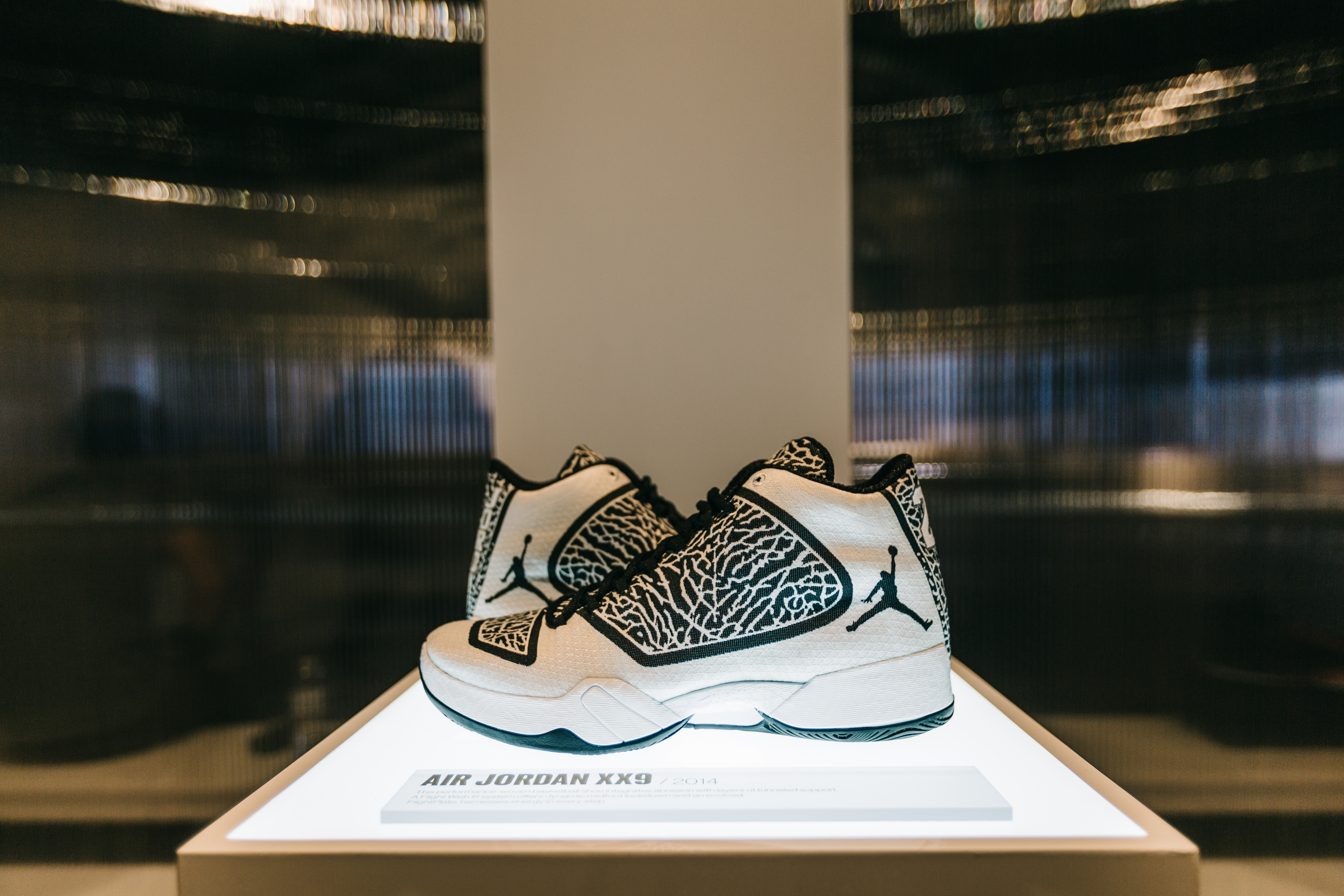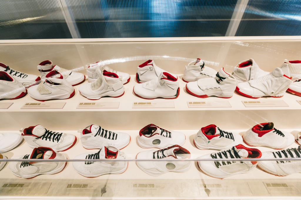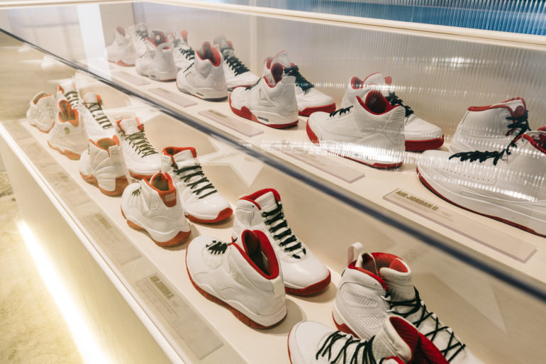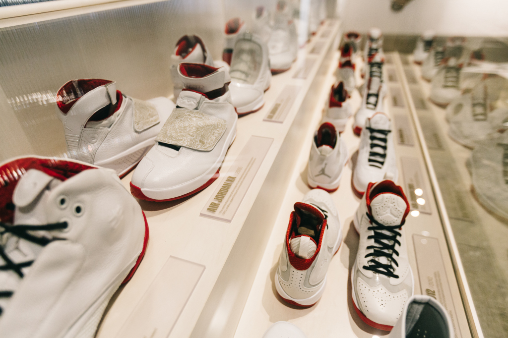 Entering the Jordan Hangar (where the hashtag #takeflight in cement greets every high flier on the way in) guests walk down a mini Hollywood Blvd. Walk of Fame, with each Jordan Brand basketball athlete getting their own star. On the wall in front as you turn into the open space: a white wall with artistic carvings of MJ’s accomplishments.