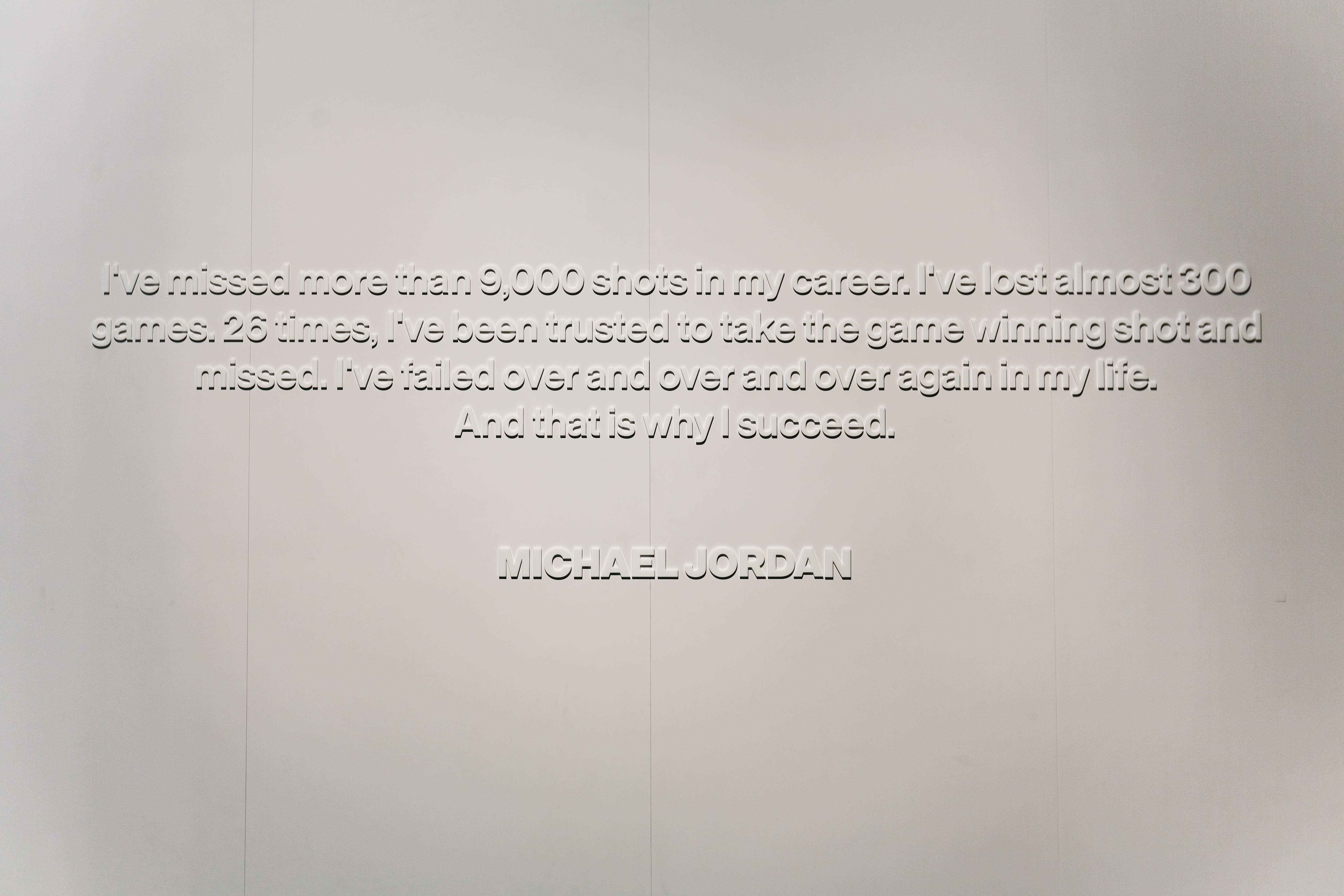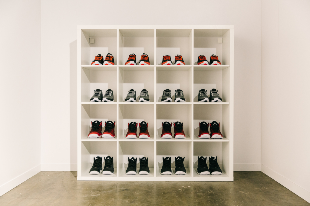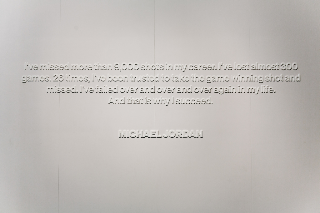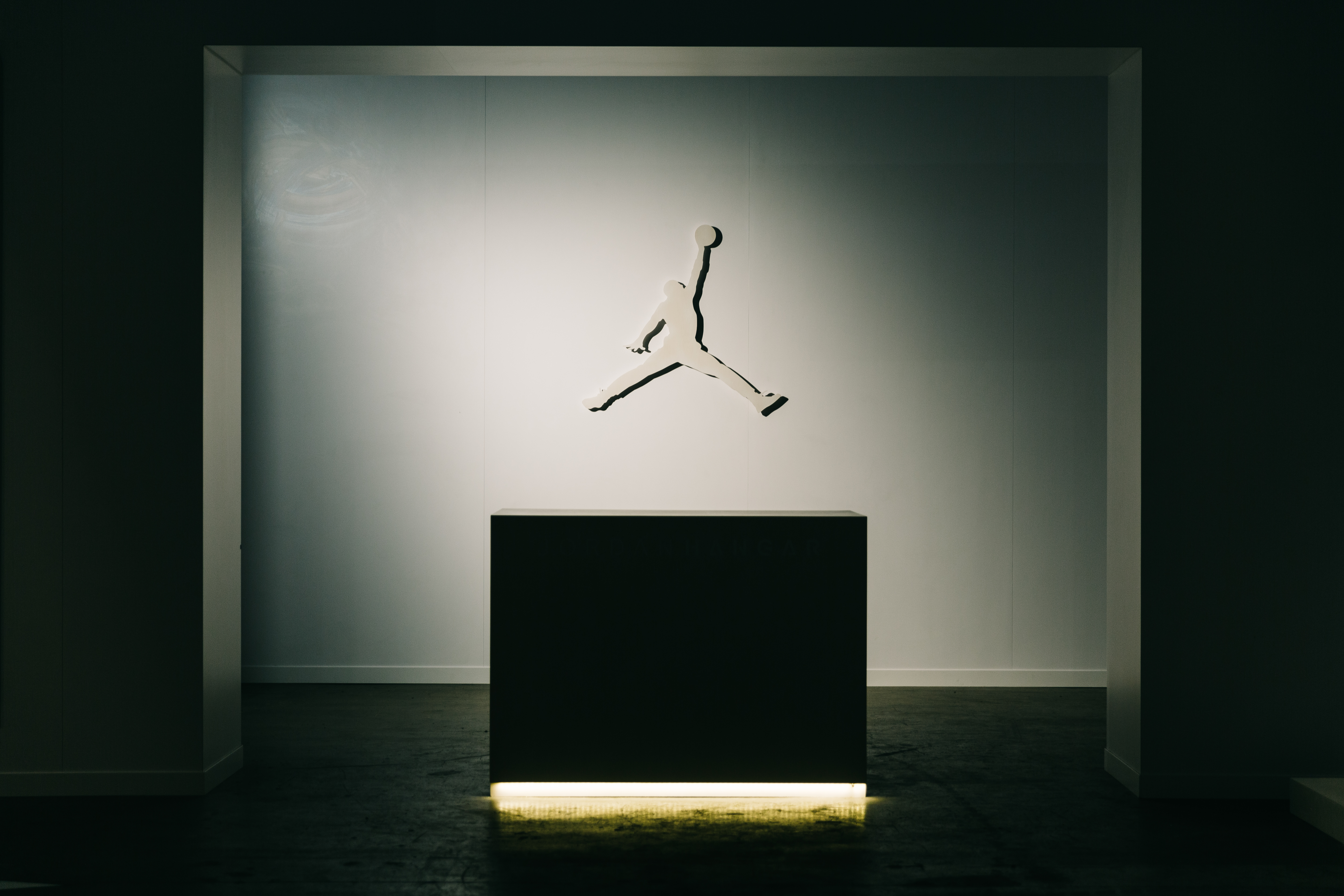 Entering the Jordan Hangar (where the hashtag #takeflight in cement greets every high flier on the way in) guests walk down a mini Hollywood Blvd. Walk of Fame, with each Jordan Brand basketball athlete getting their own star. On the wall in front as you turn into the open space: a white wall with artistic carvings of MJ’s accomplishments.