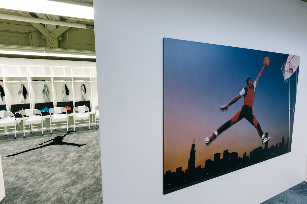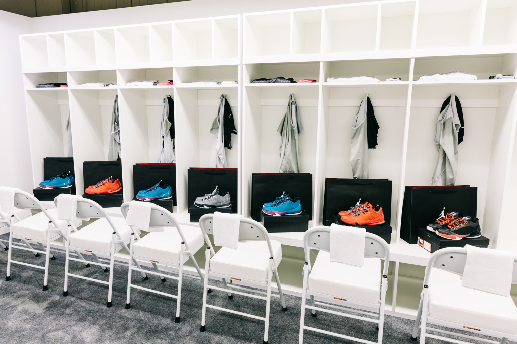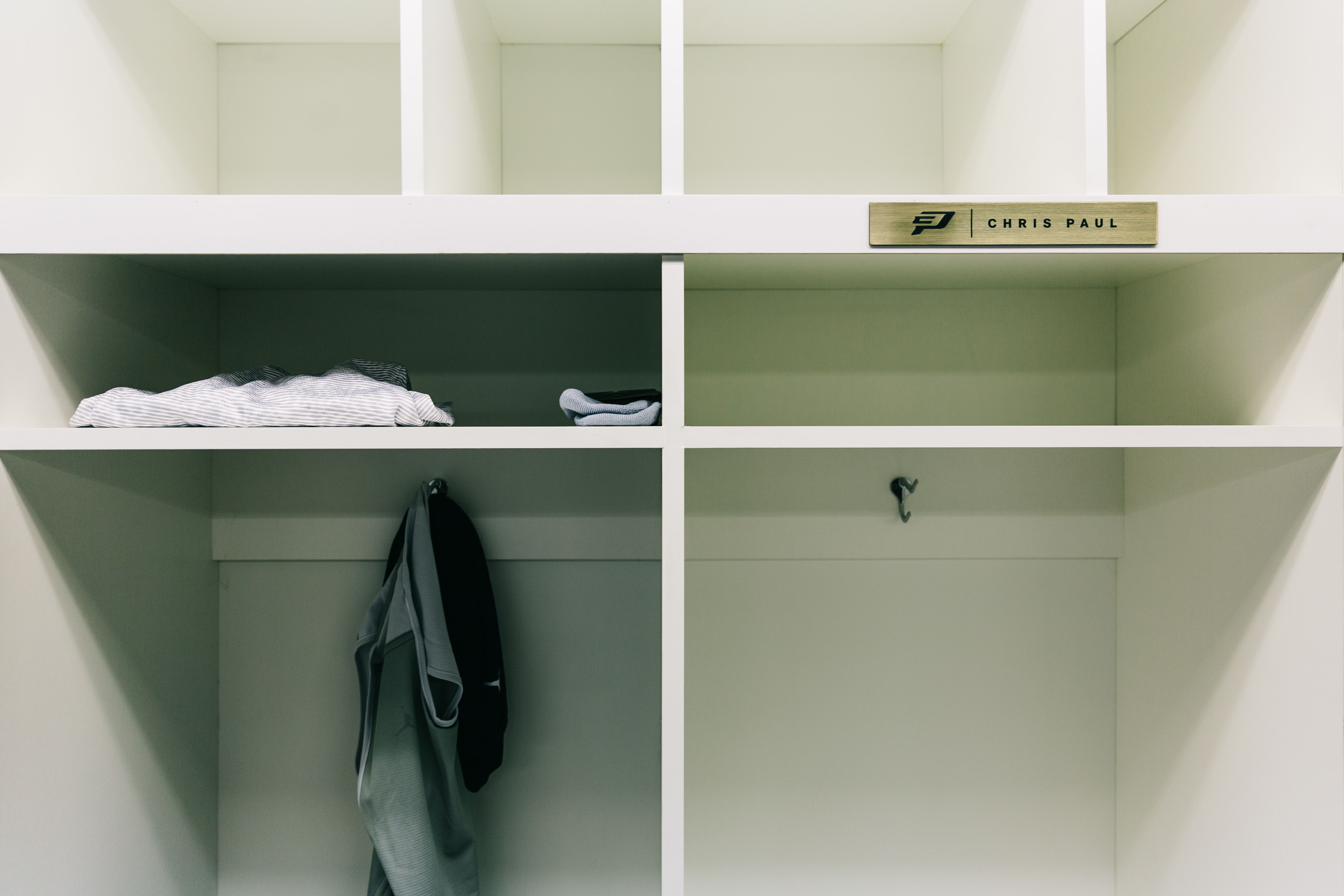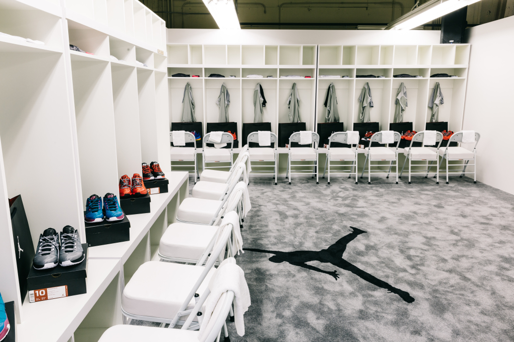 The Jordan Hangar also features two NBA-style locker rooms with a dozen lockers each: one locker room for CP, another for Blake. Each player has a dedicated locker, complete with golden nameplate, which are reserved solely for their use. The locker room has a lounge with leather chairs, couches and a 75-inch flat-screen TV, set up for NBA 2K matchups.