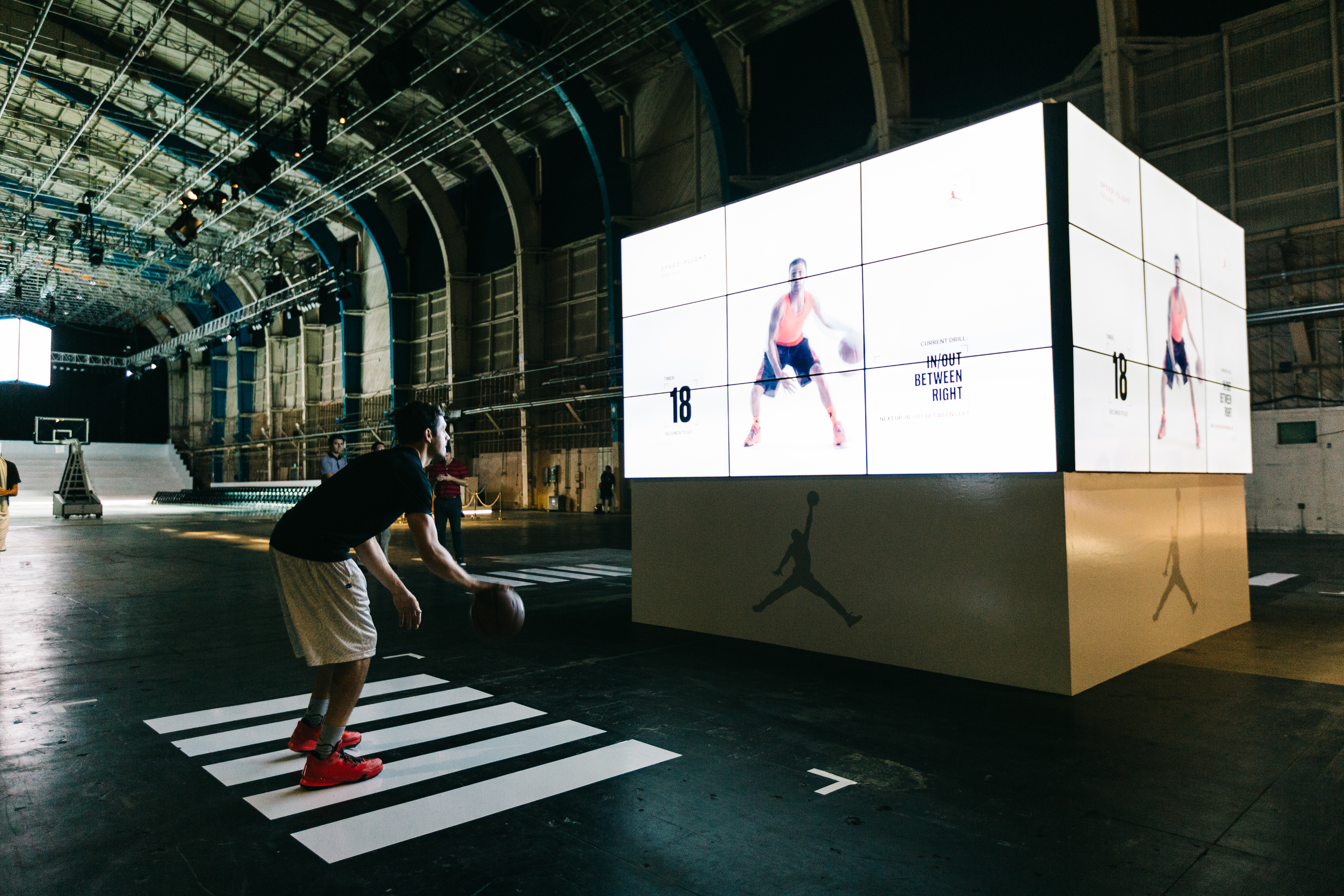 A full-size, regulation basketball court, with a stylized silver base and Jordan fractal pattern up and down the floorboards. The brand’s social/digital handle, @jumpman23, runs along the baseline, and CP and Blake’s logos are featured in the paint between the basket and free throw line. Sleek, light-colored, multi-tiered stands that rise up beyond the far backboard; and, above the court – more than halfway to the 75-foot-high rafters – is a three-paneled jumbotron, with each panel measuring 100 square feet.