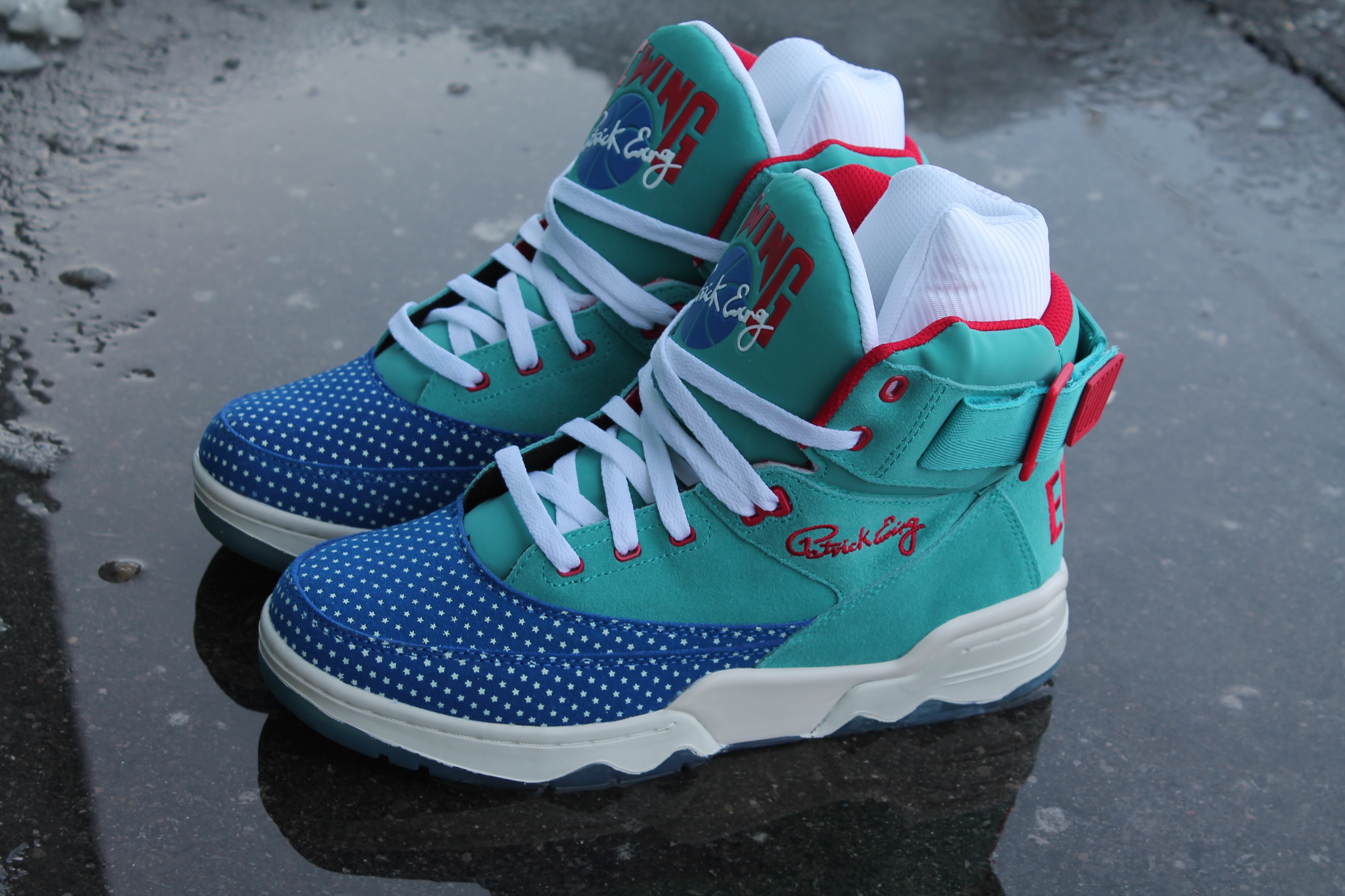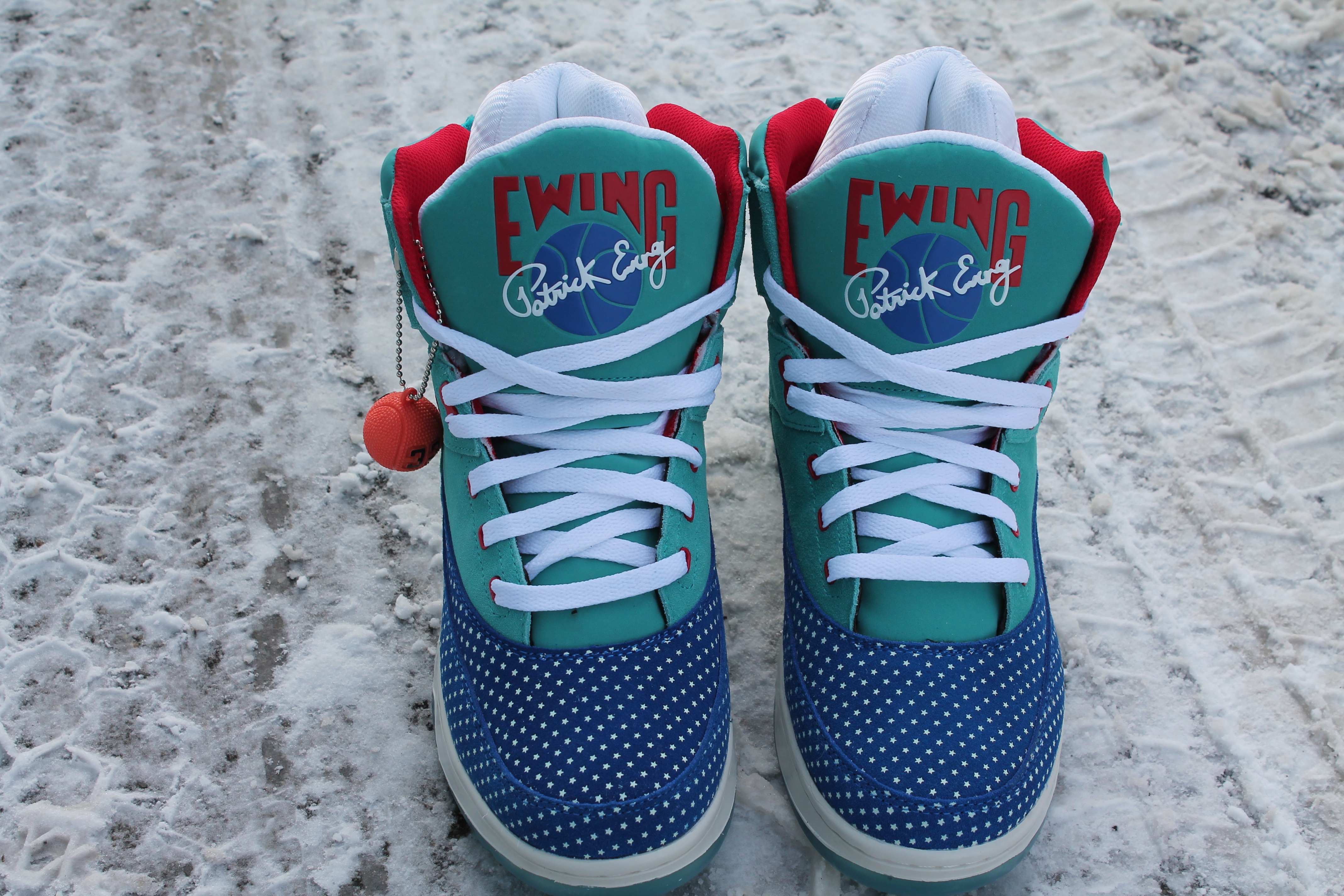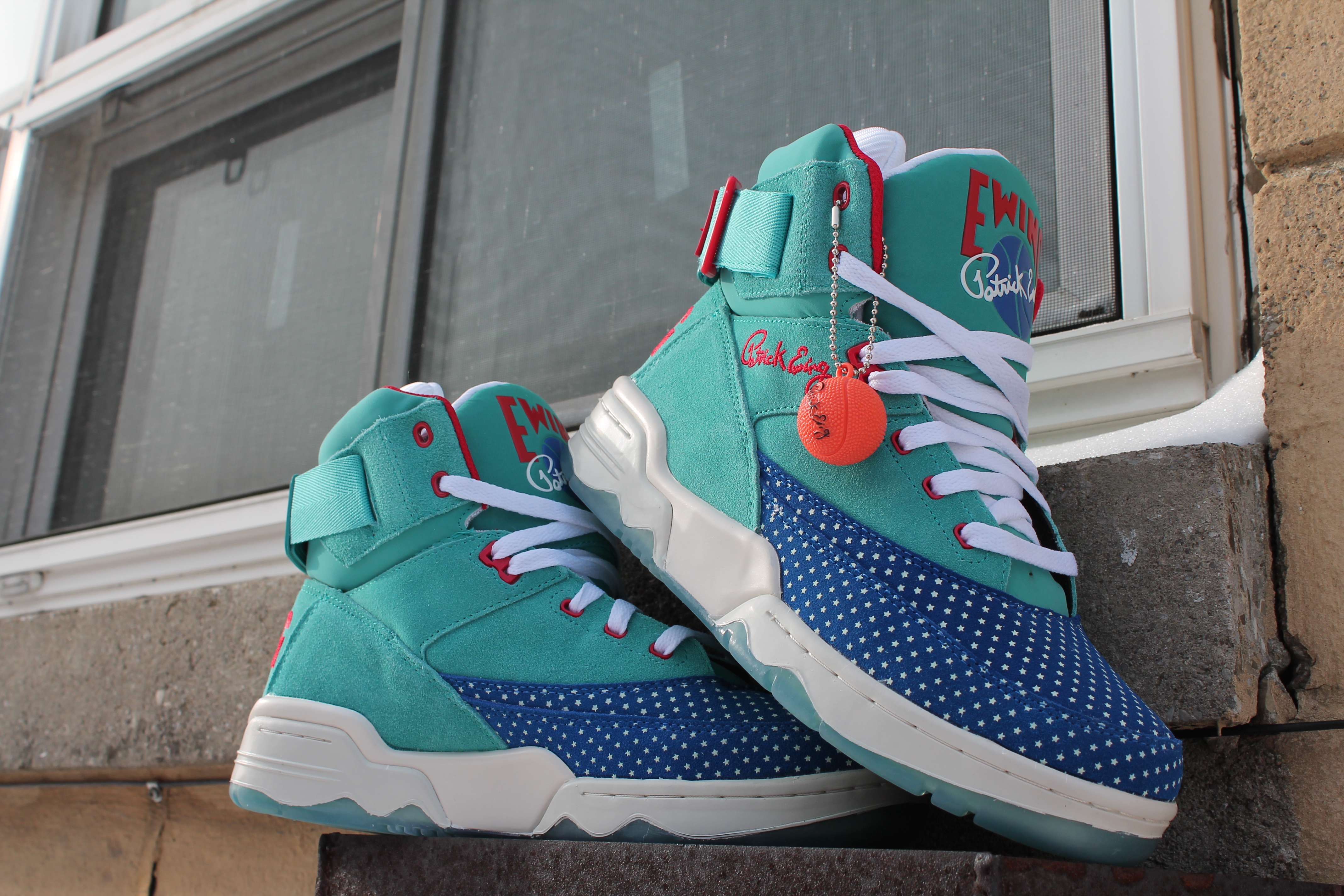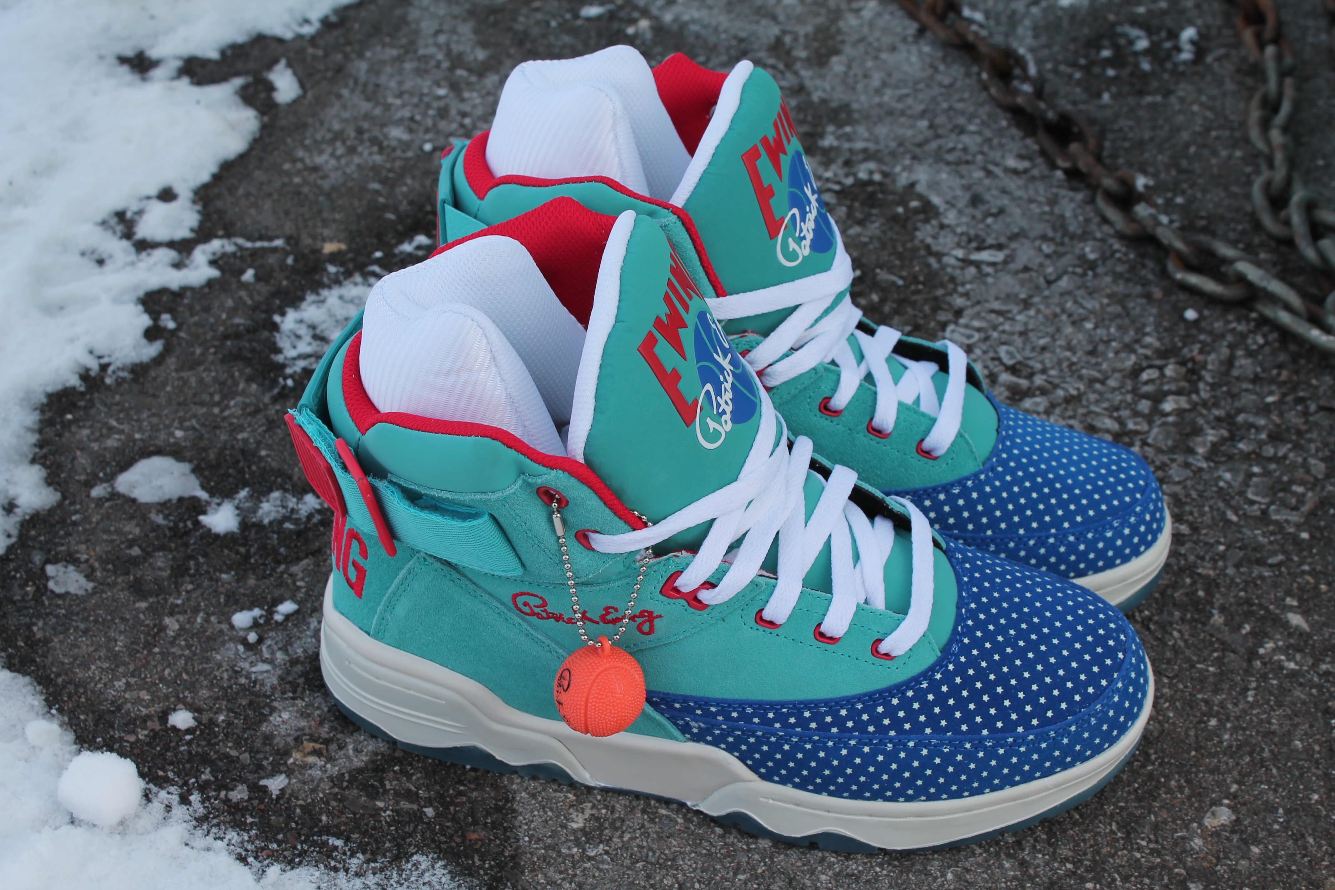 For the 25th anniversary of the game, Ewing Athletics wanted to do something special and treat the shoe as if Pat was a current player and they were making him a one off PE to wear in the game. What we get is a limited release (not available at all accounts) complete with glow in the dark stars on the toe box (to represent the All-Stars), a light sand colored midsole,clear ice blue sole (to represent the beach and ocean in Miami) as well as an upper made completely out of suede. Retail is $120 and retailers will carry sizes 5-13 (larger sizes will be available on Ewingathletics.com).