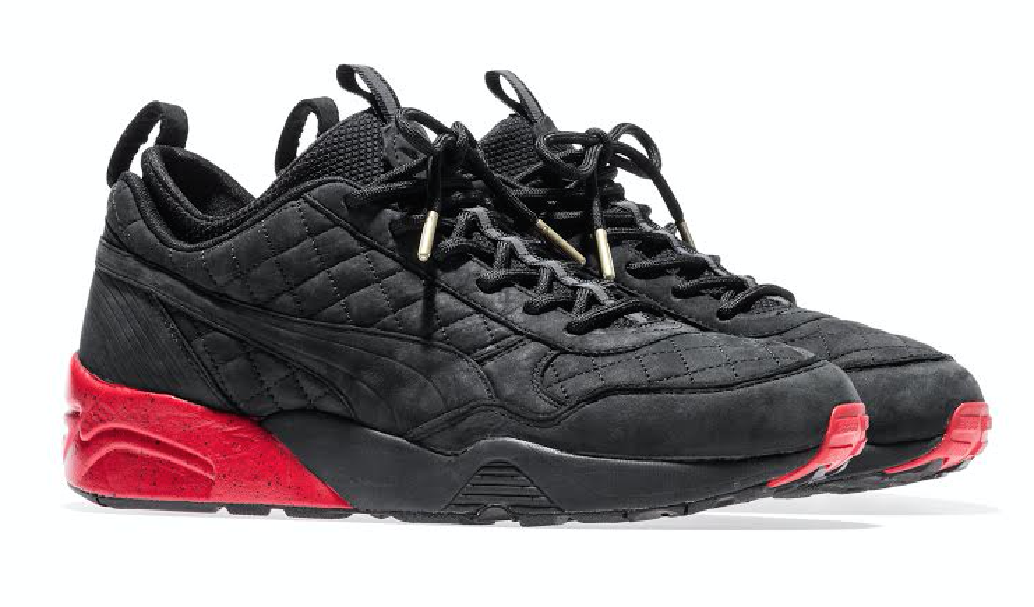 The second pair in the collection takes on a much more drastic redesign by Fieg, the R698 x HS x Ronnie Fieg. Deriving a stronger Euro-influence, this sleek model sports a black premium nubuck quilted upper with bright pops of red seen on the rear midsole and front outsole. This new silhouette updates the R698 by removing the tongue and adding a mesh-neoprene inner-sock. The upper is also deconstructed, as panels were removed to allow the classic Puma form stripes to wrap all the way around the shoe. Due to its fast-paced Ducati-like appearance, Fieg added a moto-deboss pattern to the heel wrap. Additional design cues include 3M German flag inserts on the medial form stripes and co-branded tongue patches.