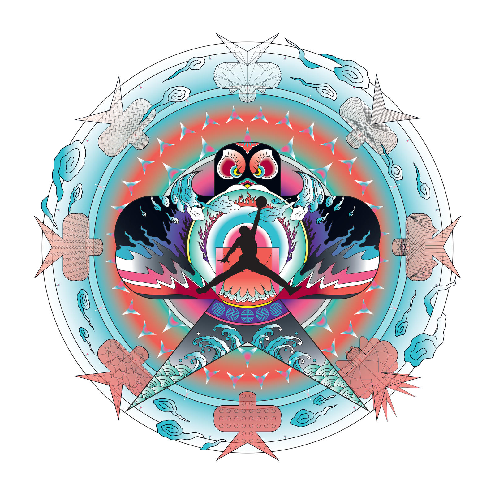 The Jordan Chinese New Year graphic integrates cues from the Air Jordan V, including the shoe’s midsole design and outsole pattern with a hidden basketball court found in the center of the graphic and includes inspirations from fighter jets and traditional Chinese kites.
