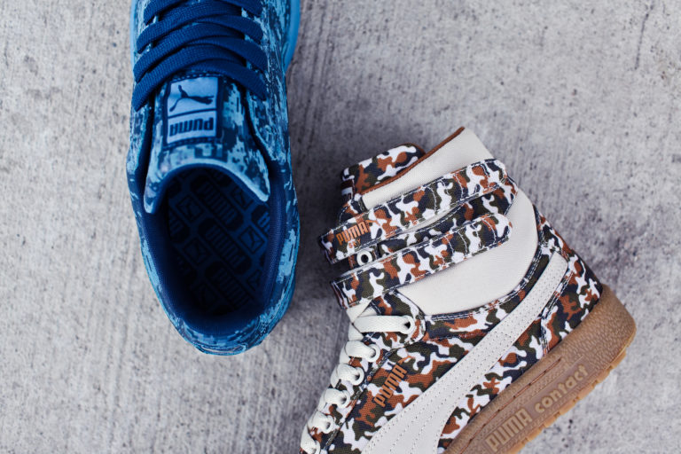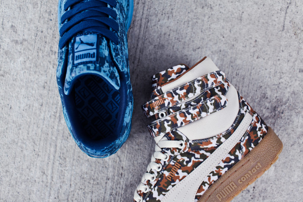 This Friday PUMA is slated to release the Camo Pack which includes a camp Suede and Sky II High. Both feature tonal camouflage treatments with the suedes outfitted in blue military camp and the Sky II in neutral camo.