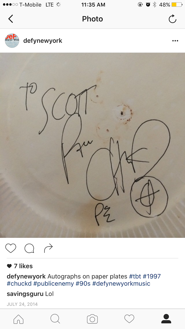 As a teenager working at a restaurant by the name of Earharts (now Jeremy’s ale house) there was the day in 1997 that Chuck D and his manager walked in on a slow night. At the end of his meal he happily chatted with the small staff that was on that night -one of which was me – and happily signed a paper plate (which I still have).