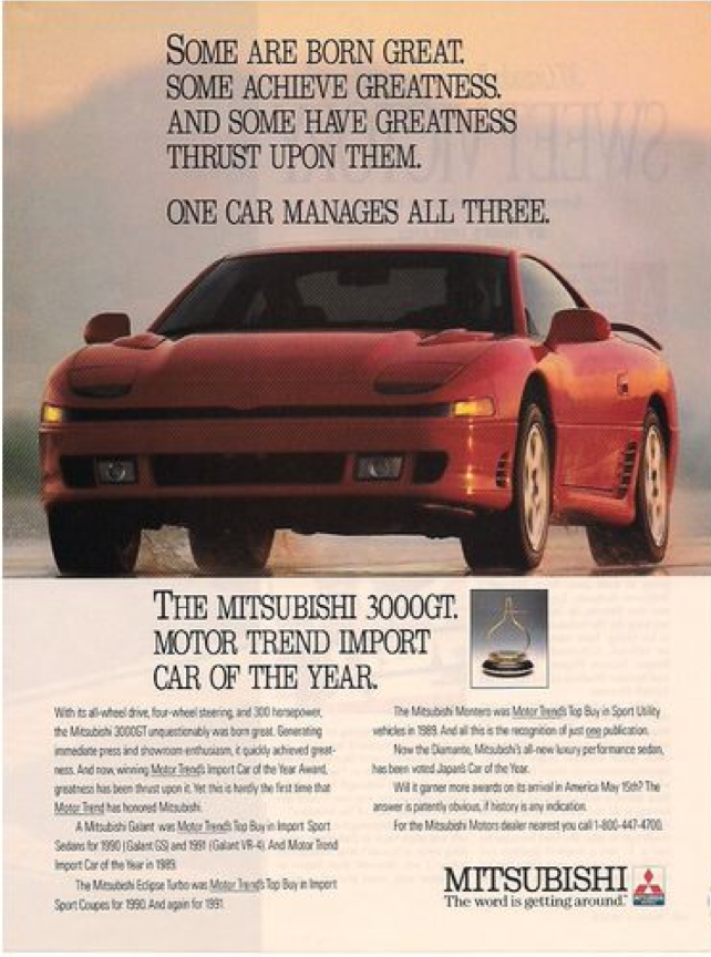 It was 1991, while watching…..probably “Who’s the boss” on TV, a commercial comes on for the all new 3000gt from Mitsubishi. The love is instant. Some 9 years later I was fortunate to own one of these beautiful machines (a 1994 model) and its a car that I will NEVER forget. Now, you have to remember in 1991 we’re talking you down with O.P.P. on your cassette player, Cross Colour t shirts, In Living Color, the beginning of mainstream alternative rock, most people don’t have cellphones (or even pagers for that matter) no Facebook, Myspace or hundreds of millions of other sites, you get the picture. Then, here comes a sports car from this Japanese company that looks like a Ferrari, features all wheel drive, climate control, motorized computer controlled front and rear spoiler and 300hp (VR-4 Model only). If you couldn’t afford the VR-4 model you were still blessed in the SL with Leather, climate control, front wheel drive (good for snow and rain) chrome wheels and 220HP (there was also a base model that featured no leather, climate control, or chrome wheels). Dodge also made a car that closely resembled the 3000gt that wen’t by the name “Stealth”. The Stealth base model was slower than the 3000gt, its turbo version just as fast but it looked like the 3000gt’s ugly brother having a typical bland American design. In 1994 the 3000gt got a bunch of updates (you can read about on Wikipedia). In 1995 and 1996 Mitsubishi offered a VR-4 and SL Spyder Version Customized by ASC in California that gave the car a retractable hard top roof (as if the car wasn’t dope enough). Sadly in 1999 the cars production finally came to an end.