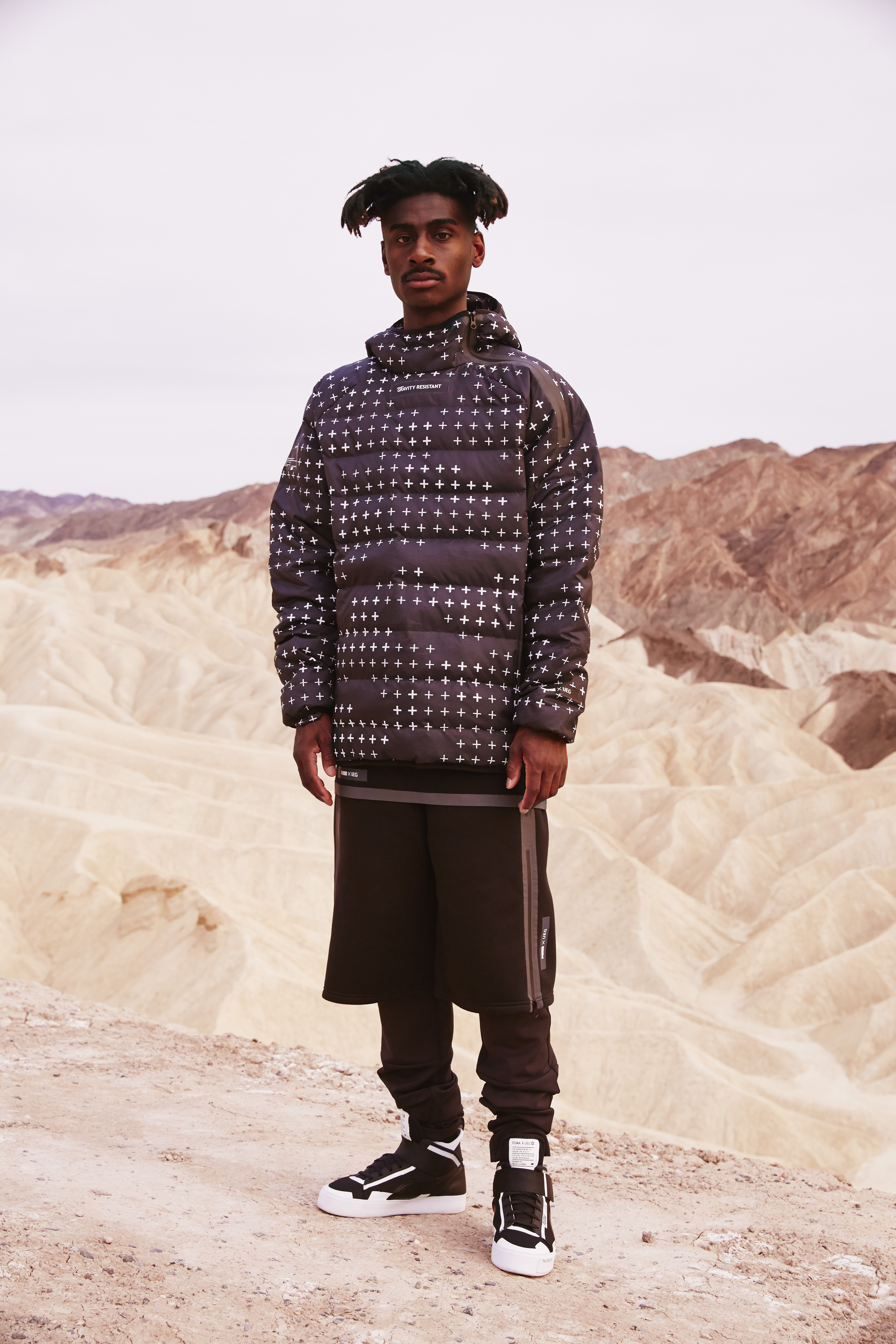 PUMA has teamed up with UEG GRAVITY RESISTANCE for a collection inspired by human need of reaching higher, traveling farther, exploring more; the need of rising beyond the reason and above the ground. It is a symbol of overcoming our own limitations, not only in the sport performance but also in personal evolution with a strong metaphor of cosmic exploration. The design refers to costumes of astronauts – mix of clean silhouettes with a bold graphic language of emergency buttons and prints in both apparel and footwear reflect the desire to being free of gravity’s restraints and common restrictions. In other words, if you’ve ever seen that TV show Humans its gear for when your robot is doing all your dirty work and you have a lot more time to style on’em in your self driving car.