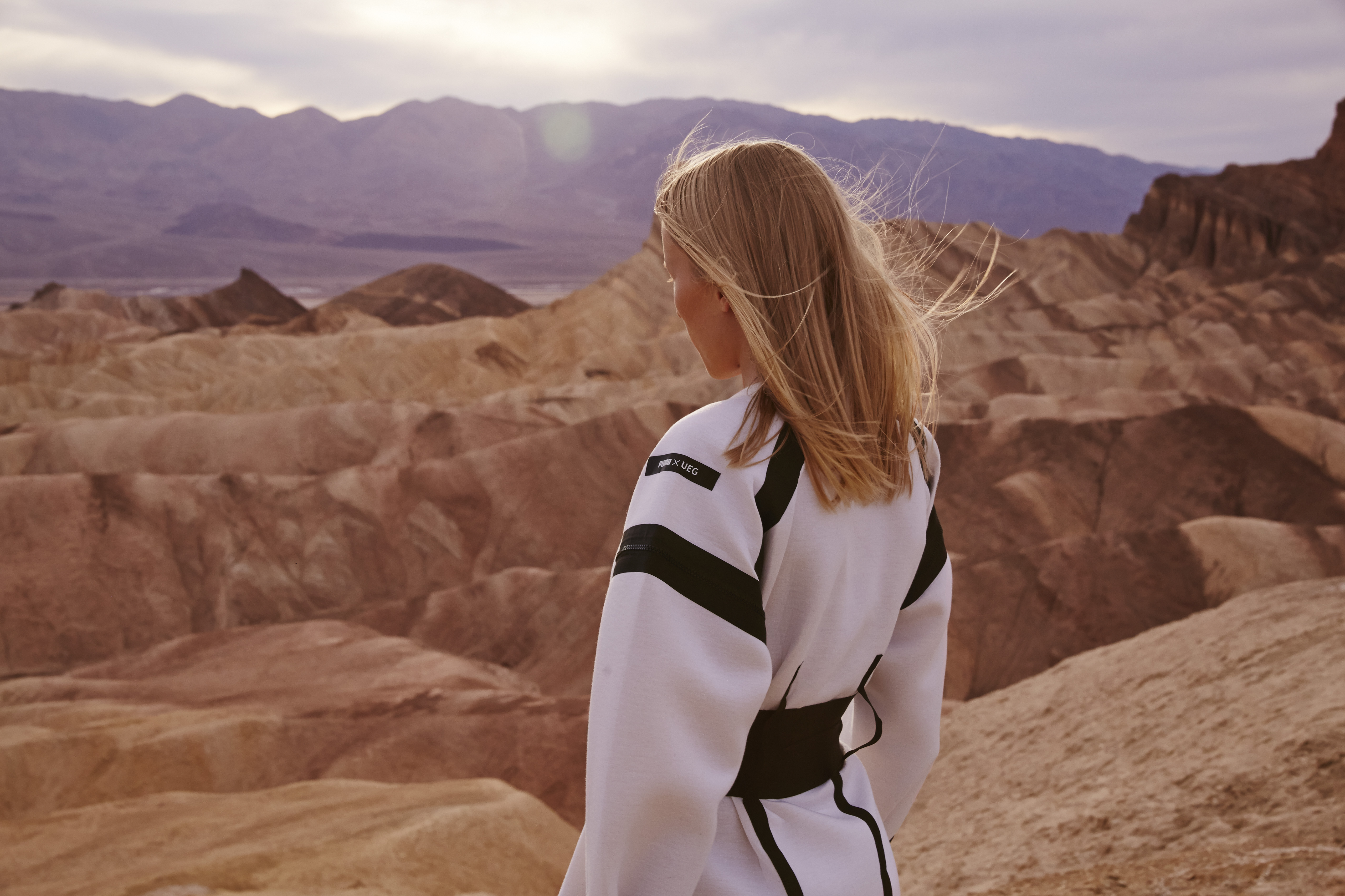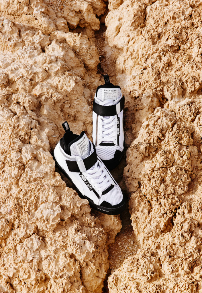 Mixing clean silhouettes with a bold graphic language the collection includes the Court Play Boot x UEG, Court Play x UEG, Court x UEG, PUMA x UEG Jacket, anti-gravity inspired sweaters, t-shirts, shorts, sweat pants, beanies and Dress all with true futuristic elements.
