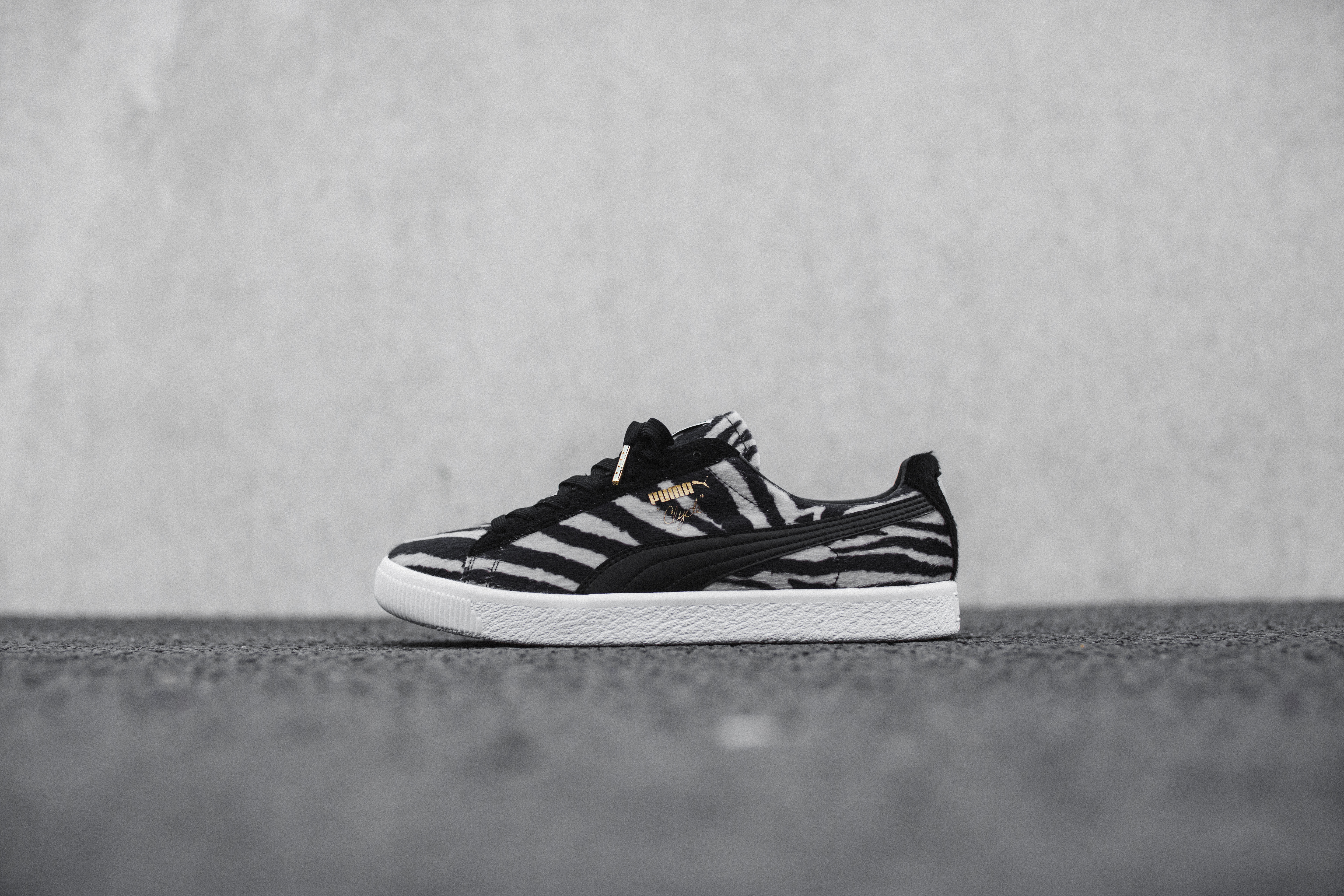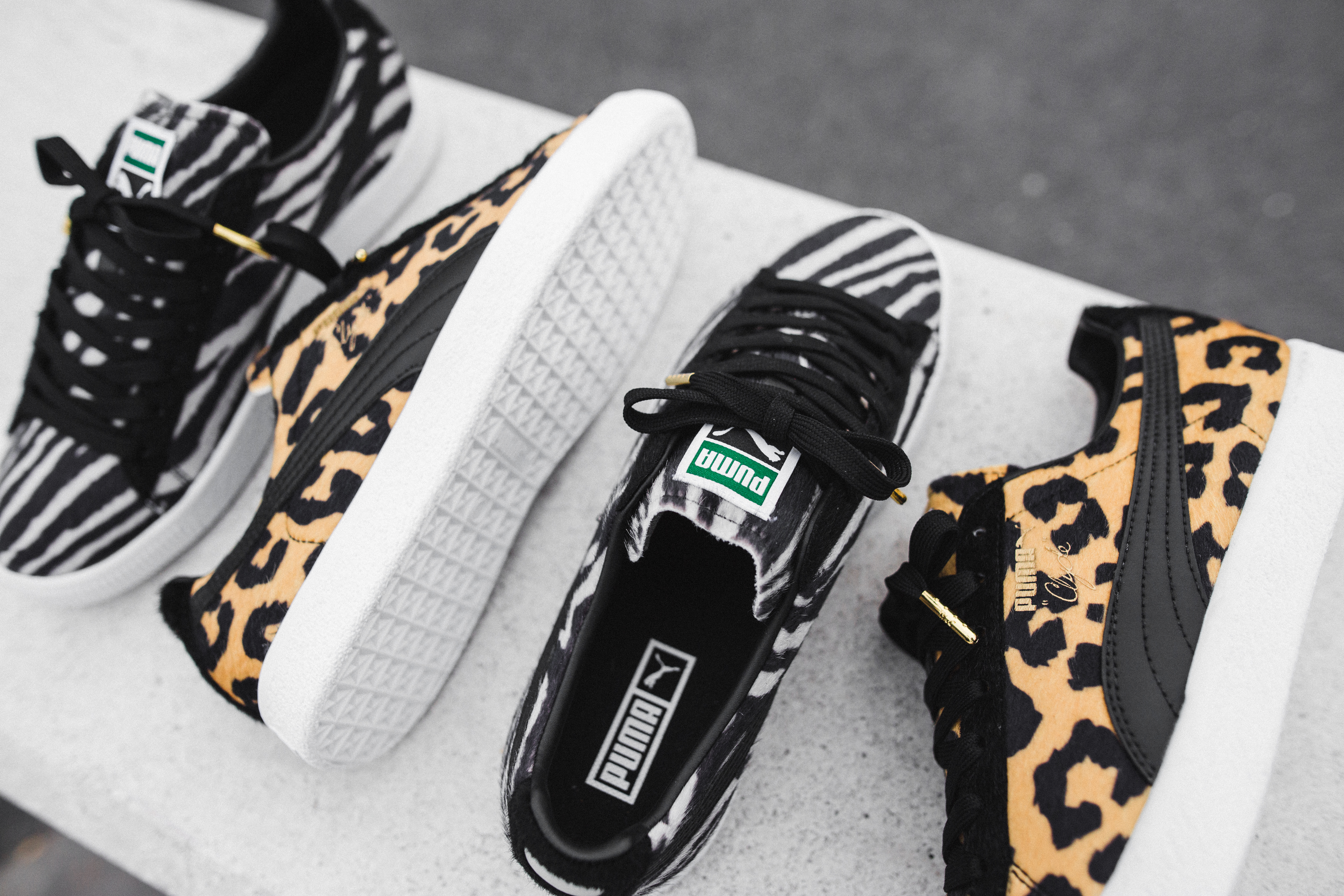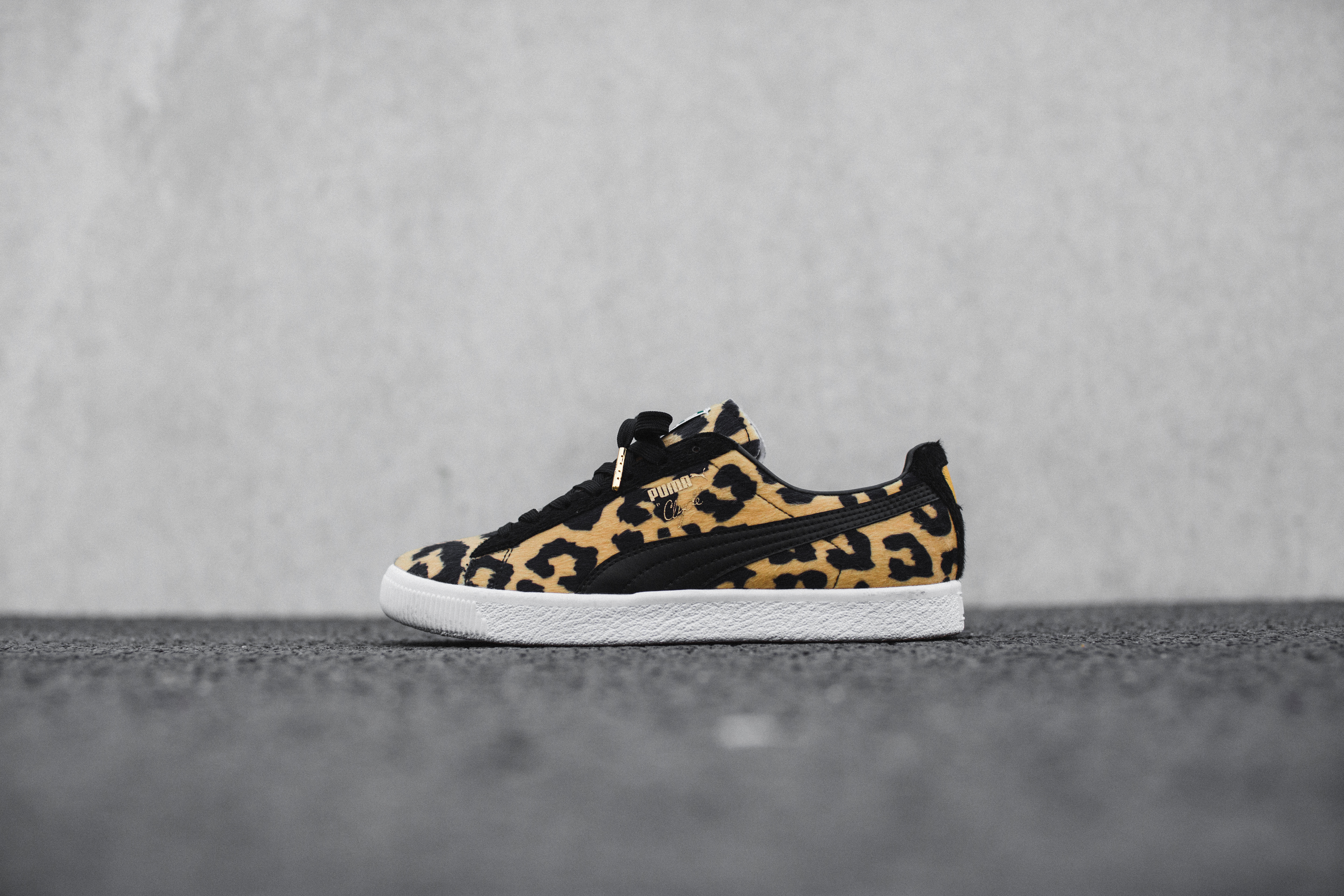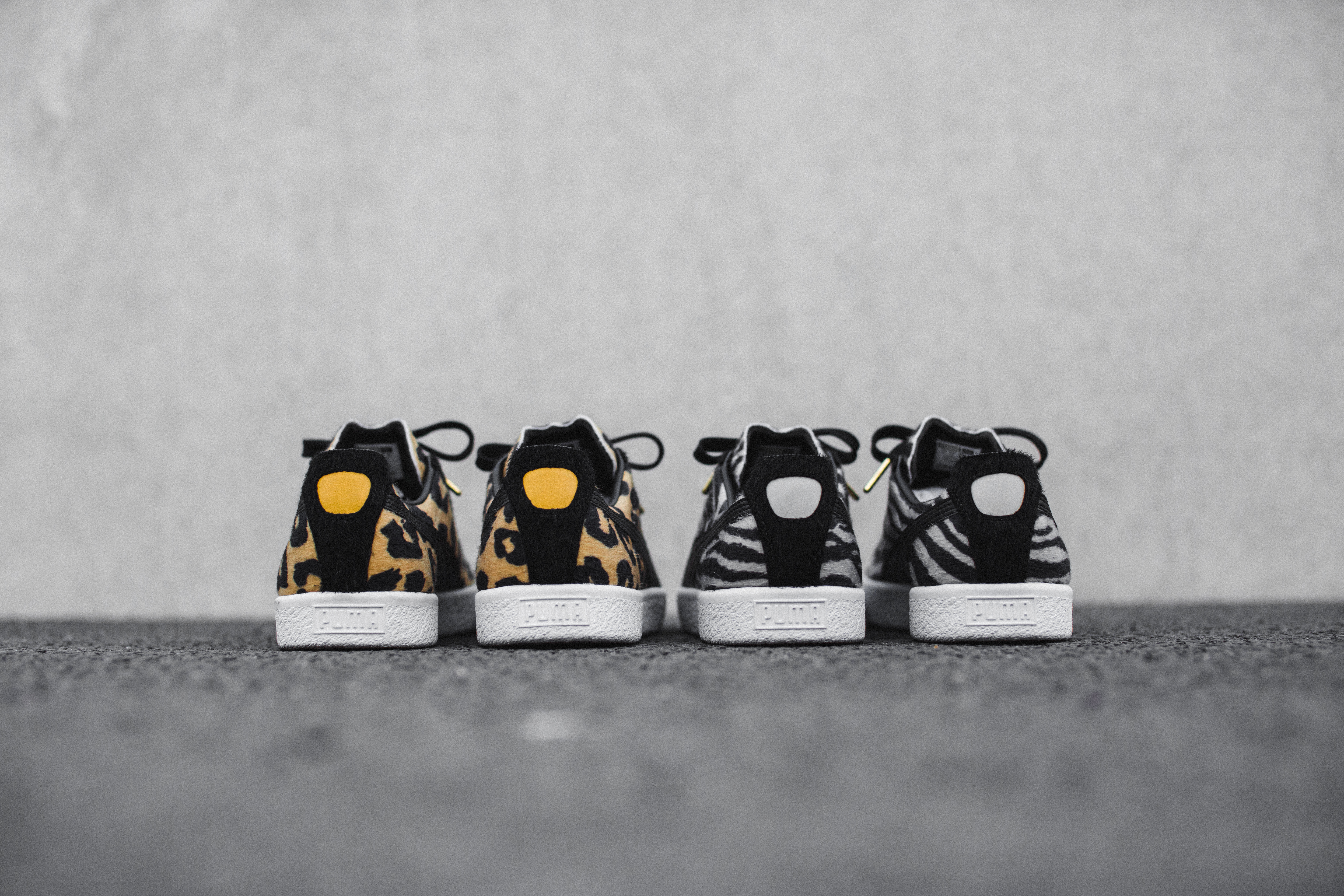 The Clyde Suits pack will come in two flavors one being in zebra and the other in leopard print The Clyde logo and lace tips are tinted in gold while a Clyde script branding is embossed on the lace tips. Both will be available globally in PUMA stores and selected retailers November 25th
