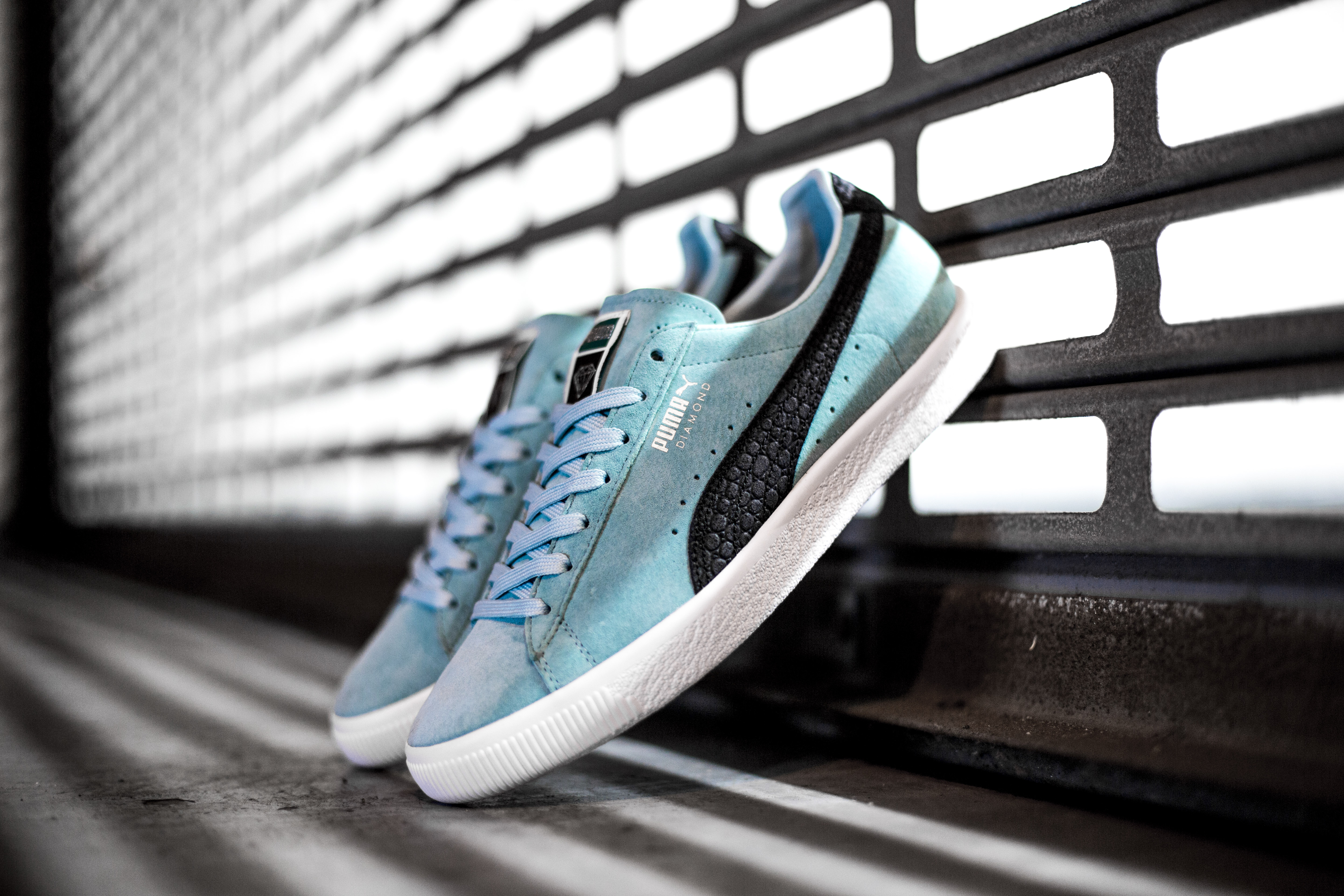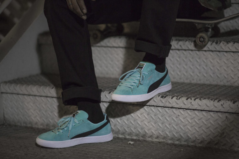 Marilyn Monroe ain’t got ish on these finely crafted Clyde’s. For the first time ever Diamond Supply and PUMA have teamed up this time for a special release of the PUMA Clyde decked out in Diamond Supply style. The upper is composed of premium soft suede leather in signature Diamond Supply color, aruba blue, contrasted with a black Formstrip that extends to the heel. The tongue is marked with co-op branding that features the iconic diamond logo. The insoles have been given a Diamond Supply treatment as well with an original prism diamond graphic. All these premium detailing sit atop the PUMA Clyde trademark grippy rubber sole which many skaters find perfect for boarding.