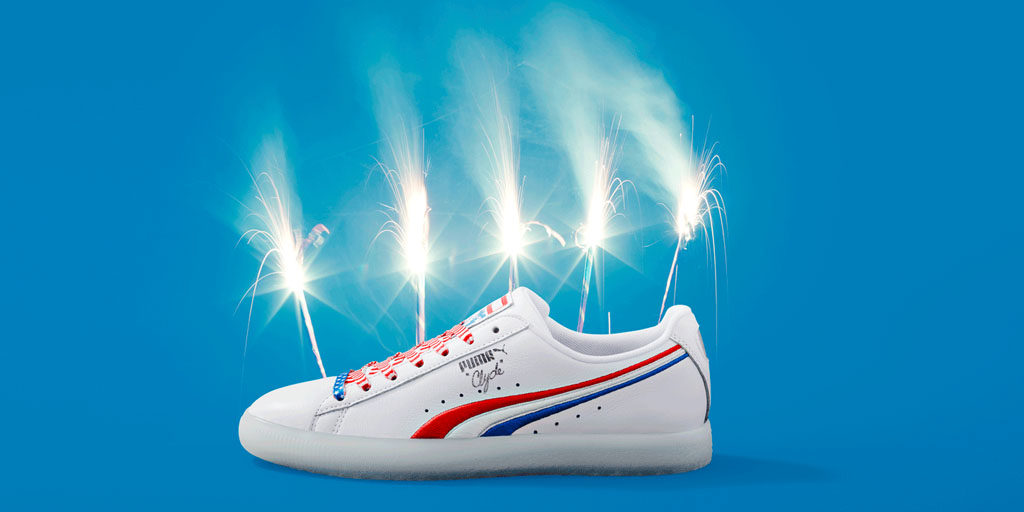 The infamous PUMA Clyde is re-worked into the PUMA Clyde 4th of July. The new style features an all-over white upper complimented by a red, white and blue formstripe. The silhouette is paired with two laces, one white lace and one starred shoe lace and available just in time for that backyard BBQ at PUMA.com for $90.00