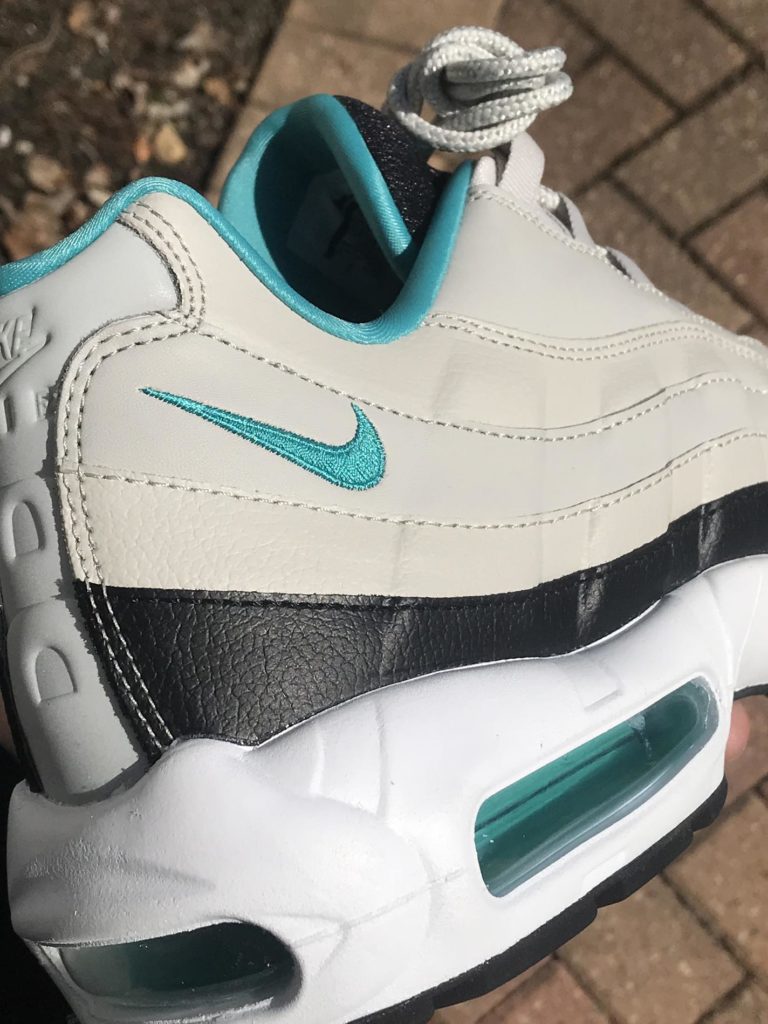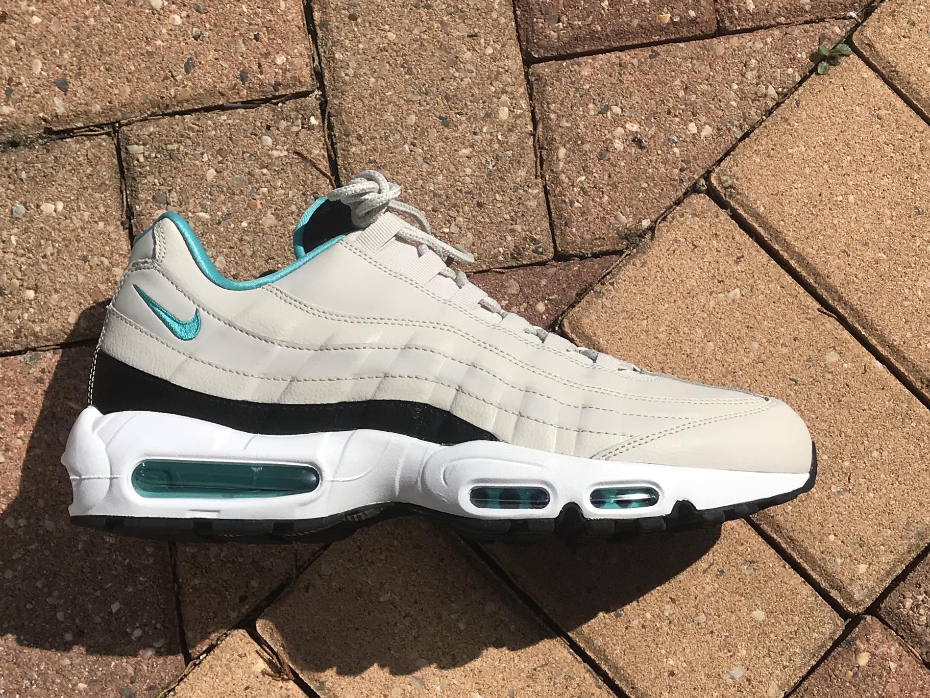 This Nike Air Max 95 Essential features a very nice light bone leather upper with hits of black and Turquoise throughout the shoe in a very nice quality build.