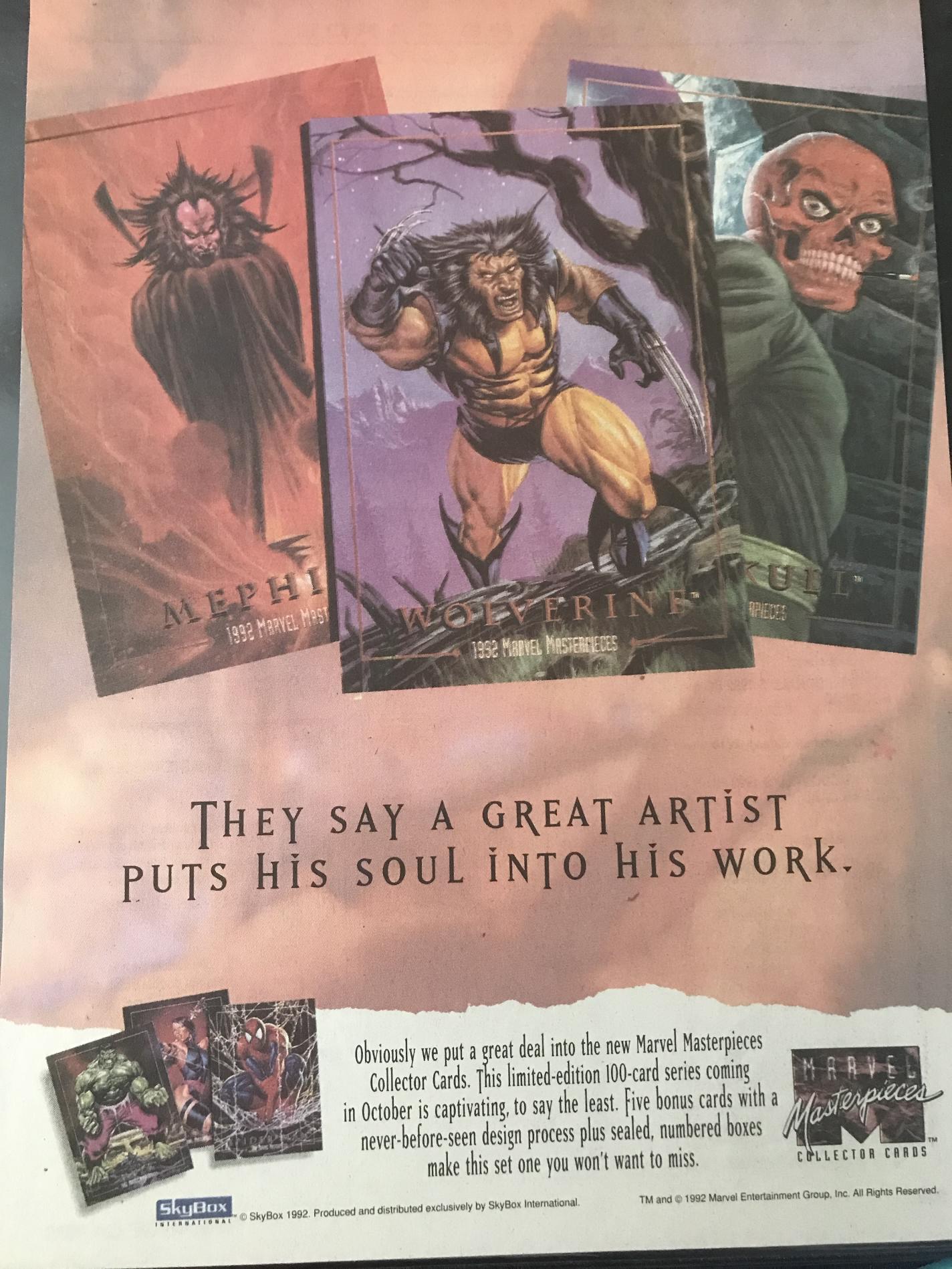 Like most kids my age back in 1992 I sweated a lot of $%^&. Sports,sneakers, video games, sports cards, comics and oh yea comic trading cards. In the earliest part of the 90’s I had them all (all of which I will cover over the coming days) but none stood out to me quite like Marvel Masterpieces series 1 did/does. Published by Skybox each card was a beautiful portrait painted by Joe Jusko.