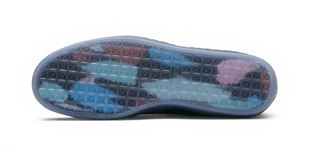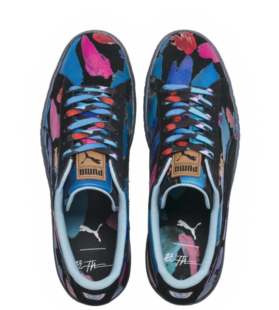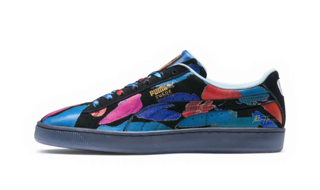 With the Suede as his canvas, Bradley splashes its signature plush upper with hand-painted Pantone stains in vibrant blues, pinks, reds with black as contrast.