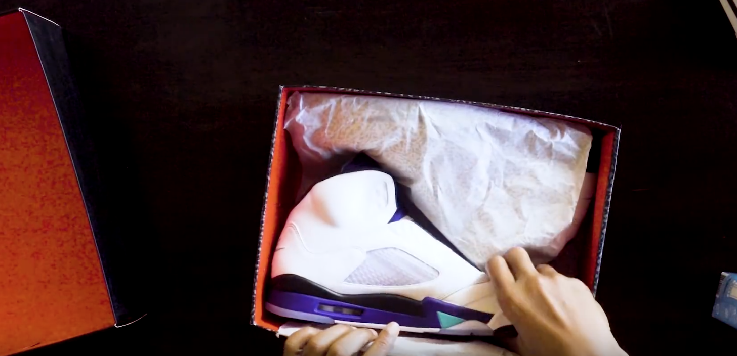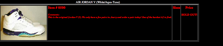 Sitting like a shrink wrapped masterpiece on a wall that included other masterpieces such as the Nike Air Trainer SC II, SC III, Tech Challenge II, Nike Air Command Force Pump, Reebok Twilight Zone and SXT Pumps -among tons of other gems -there stood the one everyone wanted, the Nike Air Jordan V in a stunning white, black, purple and teal.