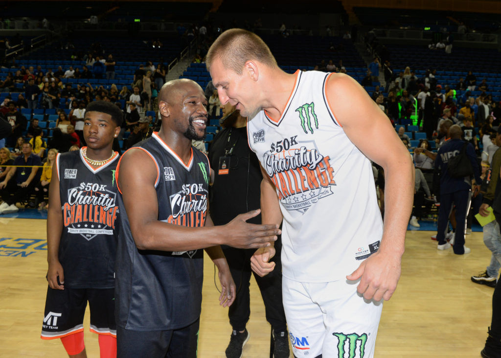WESTWOOD, CALIFORNIA – JULY 08: Rob Gronkowski (R) and Floyd Mayweather have a word after the Monster Energy $50K Charity Challenge Celebrity Basketball Game at UCLA’s Pauley Pavilion on July 08, 2019 in Westwood, California. (Photo by Vivien Killilea/Getty Images for Idol Roc )