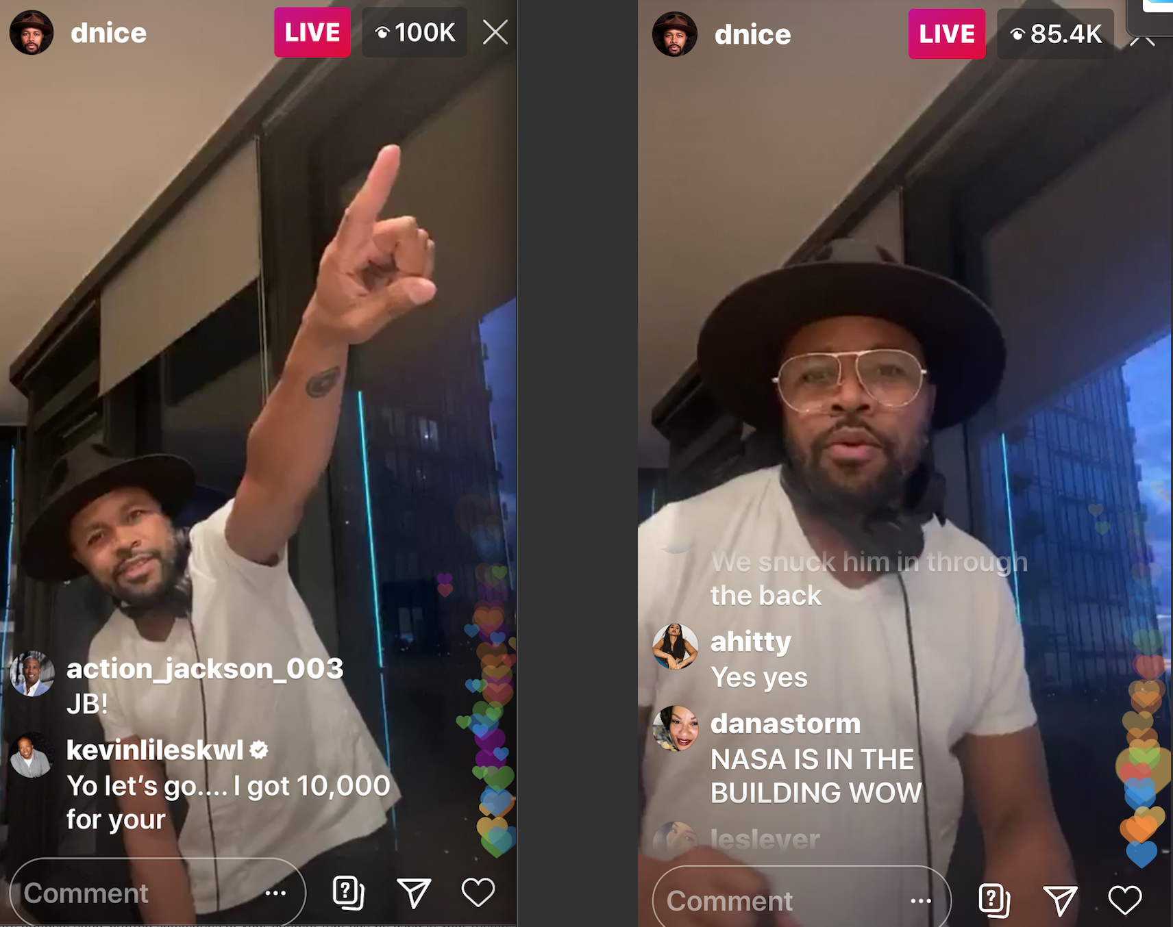 If you haven’t been following D-Nice for the past couple of days but more specifically tonight then you my friend have missed out on a historical moment. With the entire country on home lockdown and the world in the middle of a fight against COVID-19 D-Nice brought together on Instagram Live everyone from Donald Trump to Bernie Sanders, Mark Zuckerberg, Joe Biden, Mike Tyson, Oprah, NASA, Rihanna and MANY MANY more ultimately hitting OVER 100k people at one time and probably surpassing over a million over the past several days. Check out some screen shots below and make sure to follow @dnice on IG Live NOW!